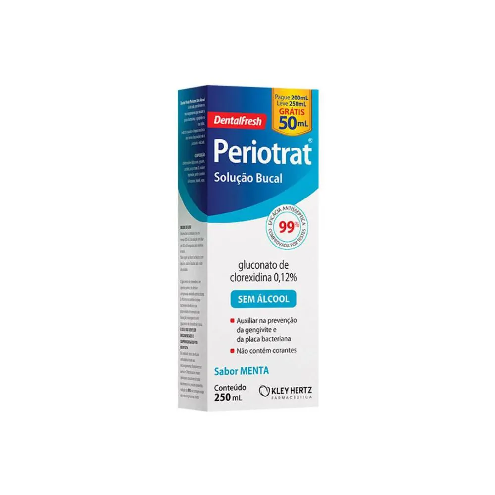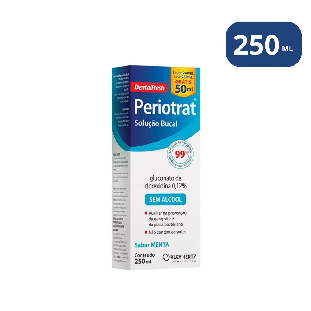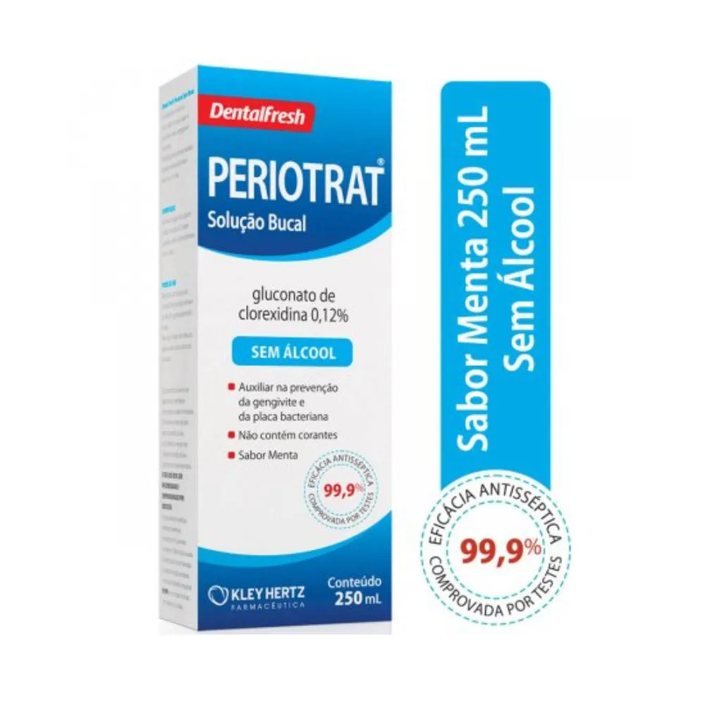 Kit 2 Solução Bucal Periotrat Sem Alcool Sabor Menta 250ml - Kley Hertz A Solução BucaSolução Bucal Periotrat Sem Alcool Sabor Menta 250ml - Kley Hertz A Solução Bucal Periotrat Menta é a alternativa perfeita para tratar a placa bacteriana com eficiência e segurança. Além de auxiliar na prevenção de gengivite, possui 99,6% de eficácia. É indicada para eliminar microorganismos que causam o mau hálito e pode ser usada para substituir a escovação, quando necessário. Possui Gluconato de Clorexidina, um agente químico com ação antimicrobiana de efetividade comprovada. Periotrat é uma linha de enxaguatórios bucais antissépticos indicados para eliminar os microorganismos que causam a placa bacteriana, a gengivite e o mau hálito. O gluconato de clorexidina é um agente químico de efetiva e comprovada atividade antimicrobiana. É eficiente no controle da placa bacteriana devido às suas propriedades de retenção e de liberação prolongada do ativo (gluconato de clorexidina) na boca. MODO DE USO: Bochechar o conteúdo de uma tampa (20 ml) da solução sem diluir por 30 a 45 segundos pela manhã e a noite. Não ingerir ou fazer bochechos com água ou outros líquidos após o uso do produto. INDICAÇÃO: Indicado quando a limpeza mecânica dos dentes (escovação) não é possível ou indicada. PRECAUÇÕES: Usar somente em bochechos. Não engolir. Usar somente sob recomendação do dentista. Podem ocorrer manchas nos dentes e em restaurações observáveis após o uso do produto ao longo do tempo. Este tempo varia de pessoa para pessoa. Estas manchas são externas e podem ser removidas com profilaxia profissional. Pode ocorrer perda temporária de paladar que retorna após a interrupção do uso. Manter fora do alcance das crianças. O seu uso deve ser recomendado e supervisionado por dentista. SOBRE A LOJA: Somos a rede de farmácias mais antiga de São José dos Pinhais, atuando no ramo farmacêutico desde 1990 com comprometimento à qualidade e satisfação do cliente. É um prazer compartilhar os nossos valores e as nossas conquistas com quem confia no nosso trabalho! Imagens dos Produtos são Meramente Ilustrativas. Todas as Informações Divulgadas são de Responsabilidade Exclusiva do Fabricante/fornecedor.l Periotrat Menta é a alternativa perfeita para tratar a placa bacteriana com eficiência e segurança. Além de auxiliar na prevenção de gengivite, possui 99,6% de eficácia. É indicada para eliminar microorganismos que causam o mau hálito e pode ser usada para substituir a escovação, quando necessário. Possui Gluconato de Clorexidina, um agente químico com ação antimicrobiana de efetividade comprovada. Periotrat é uma linha de enxaguatórios bucais antissépticos indicados para eliminar os microorganismos que causam a placa bacteriana, a gengivite e o mau hálito. O gluconato de clorexidina é um agente químico de efetiva e comprovada atividade antimicrobiana. É eficiente no controle da placa bacteriana devido às suas propriedades de retenção e de liberação prolongada do ativo (gluconato de clorexidina) na boca. MODO DE USO: Bochechar o conteúdo de uma tampa (20 ml) da solução sem diluir por 30 a 45 segundos pela manhã e a noite. Não ingerir ou fazer bochechos com água ou outros líquidos após o uso do produto. INDICAÇÃO: Indicado quando a limpeza mecânica dos dentes (escovação) não é possível ou indicada. PRECAUÇÕES: Usar somente em bochechos. Não engolir. Usar somente sob recomendação do dentista. Podem ocorrer manchas nos dentes e em restaurações observáveis após o uso do produto ao longo do tempo. Este tempo varia de pessoa para pessoa. Estas manchas são externas e podem ser removidas com profilaxia profissional. Pode ocorrer perda temporária de paladar que retorna após a interrupção do uso. Manter fora do alcance das crianças. O seu uso deve ser recomendado e supervisionado por dentista. SOBRE A LOJA: Somos a rede de farmácias mais antiga de São José dos Pinhais, atuando no ramo farmacêutico desde 1990 com comprometimento à qualidade e satisfação do cliente. É um prazer compartilhar os nossos valores e as nossas conquistas com quem confia no nosso trabalho! Imagens dos Produtos são Meramente Ilustrativas. Todas as Informações Divulgadas são de Responsabilidade Exclusiva do Fabricante/fornecedor.
