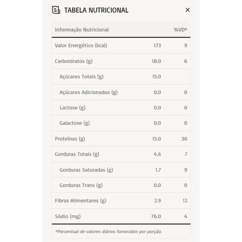 - Snack proteico com ingredientes naturais.