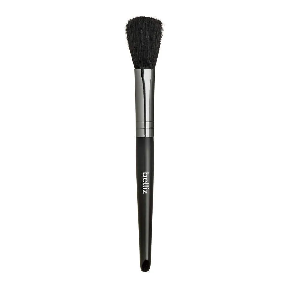 Pincel de maquiagem pequeno para aplicação de blush. Cerdas naturais. Cabo em madeira. Para aplicação de blush e iluminadores em pó em pequena quantidade.