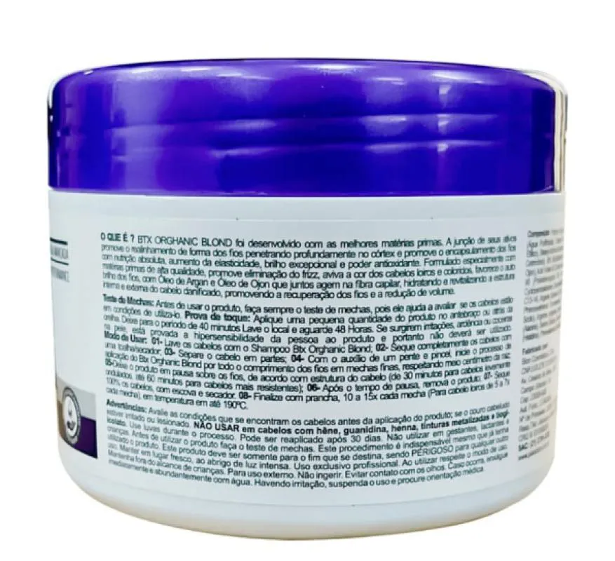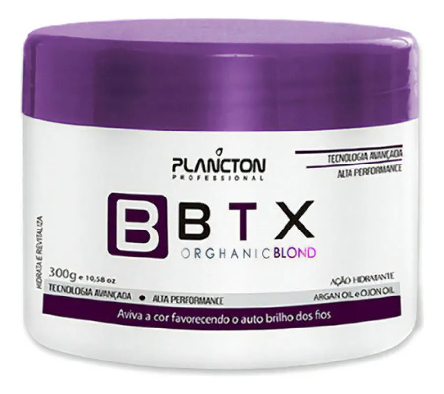 Plancton BTX Blondelimina o frizz e reduz o volume em cabelos coloridos, descoloridos e grisalhos. Sua fórmula com altíssima tecnologia e eficiente penetrabilidade no córtex, promove o encapsulamento dos fios com nutrição absoluta, aumento da elasticidade, brilho excepcional e poder antioxidante. Possui Óleo de argan e Óleo de ojon, que juntos hidratam e revitalizam a estrutura interna e externa do cabelo danificado, promovendo a recuperação dos fios. O resultado é um cabelo macio, sedoso e brilhante. Modo de usar: Lave os cabelos com o shampoo hidratante BTX Platinum e seque completamente os cabelos com uma toalha. Separe o cabelo em partes, e com o auxílio de um pente e pincel, inicie o processo de aplicação do Btx Blond por todo o comprimento dos fios em mechas finas, respeitando meio centímetro da raiz. Deixe o produto em pausa sobre os fios, de acordo com a estrutura do cabelo (de 30 minutos para cabelos levemente ondulados, até 60 minutos para cabelos mais resistentes). Após o tempo de pausa, remova o excesso com pente ou leve enxágue, removendo 50% do produto (para cabelos loiros ou coloridos, remover 70%). Seque 100% os cabelos, com escova e secador. Finalize com prancha, 10 a 15x cada mecha (Para cabelo loiros de 5 a 7x cada mecha), em temperatura em até 190ºC.