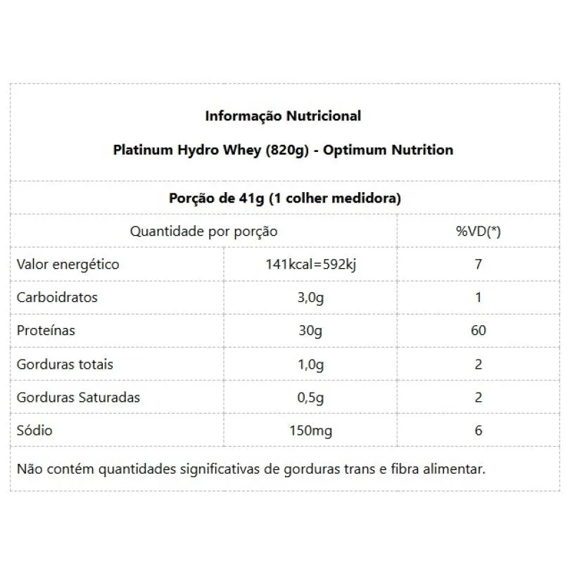 Platinum Hydro Whey (820g) Planinum Hidro Whey – Optimum Nutrition oferece tecnologia de proteína de absorção mais rápida, mais pura e mais avançada do mercado de suplementos. Por hidrolisar a proteína nesta fórmula premium, a Optimum Nutrition criou Hidro Whey Protein para ter uma ação mais rápida. A hidrólise consiste na quebra das proteínas maiores em pedaços menores que são capazes de entrar em seu sistema orgânico rapidamente, permitindo que os seus músculos também comecem a se reconstruir rapidamente. Para uma melhor eficácia, a Optimum Nutrition reforçou esta fórmula revolucionária com peptídeos ACTITOR™; enzimas digestivas e aminoácidos de cadeia ramificada micronizada (BCAAs). Além de ser rápido, Platinum Hydro Whey é também ultra-puro. Isso porque ele é feito inteiramente com whey protein isolada. Portanto, não há excesso de gordura, colesterol ou lactose para retardar o seu progresso de absorção. 100% das proteínas do Platinum HydroWhey são hidrolisadas em diferentes graus. A hidrólise é um processo através do qual as proteínas intactas são estrategicamente divididas em fragmentos menores, chamados peptídeos, para uma disponibilidade mais rápida e de mais fácil utilização pelo seu corpo. A combinação exclusiva de proteínas leve, moderada e proteínas ultra-hidrolisada de Optimum Nutrition fornece di-peptídeos, tri-peptídeos e oligo-peptídeos, enquanto que a retenção seleciona micro-frações naturalmente encontradas no whey. Se isso é muito técnico, tudo o que você realmente precisa entender é que Platinum Hydrowhey é um produto perfeito para o consumo pela manhã, antes dos treinos e logo após os treinos, quando os seus esforçados músculos se beneficiam mais de uma proteína de ação rápida. Benefícios: - Feito com Whey Protein Isolada Hidrolisada Avançada para uma absorção muito mais rápida e eficiente:- 30 gramas de Proteína Ultra-Pura por Dose;- Cerca de 9 Gramas de Leucina, Isoleucina e Valina (BCAAs), adicionados;- Inclui Peptídeos de Patente Pendente ACTITOR™;- Totalmente livre de Lactose ou Colesterol;- Contém Enzimas Digestivas para uma Melhor Utilização da Proteína;- Instantâneo; pode ser Misturado Facilmente com uma Colher;- Alimente e recupere seus músculos rapidamente.
