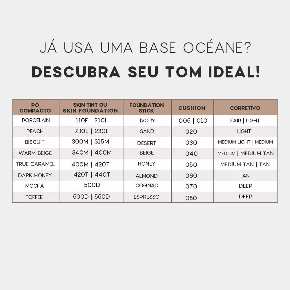 As cores Peach e Porcelain são indicadas para as peles mais claras, as cores Biscuit, Warm Beige e True Caramel são indicadas para as peles de tonalidade média e as cores Dark Honey, Mocha e Toffee combinam com tons escuros de pele.