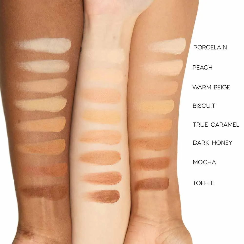 As cores Peach e Porcelain são indicadas para as peles mais claras, as cores Biscuit, Warm Beige e True Caramel são indicadas para as peles de tonalidade média e as cores Dark Honey, Mocha e Toffee combinam com tons escuros de pele.