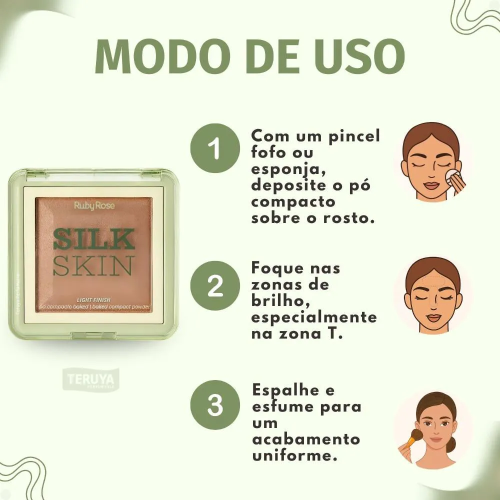 Pó Compacto Ruby Rose Silk Skin Light Finish PC30 sobre a pele do rosto, especialmente na zona T (testa, nariz e queixo), para selar a maquiagem e controlar o brilho.Espalhe suavemente para obter uma cobertura uniforme e um acabamento natural.