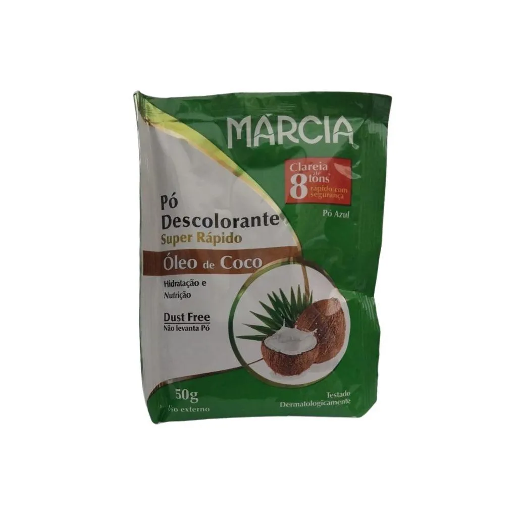 PÓ DESCOLORANTE MÁRCIA ÓLEO DE COCO 50G - KIT C/ 3UN Descrição O Pó Descolorante Márcia Óleo de Coco, em embalagem de 50g, é especialmente formulado para proporcionar um clareamento eficaz dos cabelos, enquanto mantém a hidratação e a nutrição dos fios. Enriquecido com óleo de coco, conhecido por suas propriedades hidratantes e reparadoras, este descolorante ajuda a minimizar os danos causados pelo processo de descoloração, deixando os cabelos mais suaves e brilhantes. Ideal para várias técnicas de descoloração, sua fórmula avançada garante um resultado uniforme e seguro. Modo de Uso Em um recipiente não metálico, misture o Pó Descolorante Márcia Óleo de Coco com água oxigenada até obter uma consistência homogênea. Aplique a mistura nos cabelos secos, começando pelas áreas que necessitam de maior clareamento. Deixe agir pelo tempo necessário, monitorando o clareamento até alcançar o tom desejado. Enxágue abundantemente com água morna e finalize com um shampoo e condicionador de sua preferência. É recomendado realizar um teste de mecha antes da aplicação completa para evitar possíveis reações adversas.
