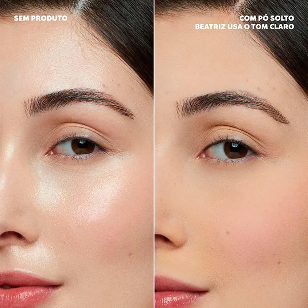 Quer matificar regiões específicas do rosto? A gente te ensina! Com um pincel menor, de cerdas bem macias, aplique o Pó Solto nos pontos onde deseja dar um acabamento matte (abaixo dos olhos, no nariz, na testa e no queixo, por exemplo). Assim, você conquista um acabamento mais leve e natural, mantendo o glow em outras regiões! Pra dosar o produto, gire a peneira pra liberar a saída do pó e despeje uma pequena quantidade na tampinha.