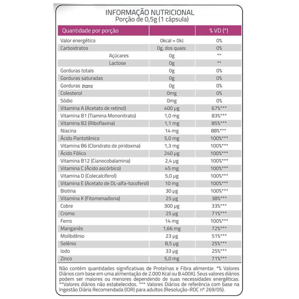 Óxido de magnésio, Pirofosfato de ferro, vitamina c, Acetato de vitamina e, Nicotinamida, Sulfato de manganês mono-hidratado, Óxido de zinco, Pantotenato de cálcio, Acetato de retinol, Fitomenadiona, Vitamina B12, Colecalciferol, Biotina, Cloridrato de piridoxina, Riboflavina, Mononitrato de Tiamina, Sulfato de cobre anidro, Molibdato de sódio di-hidratado, Iodeto de potássio, Ácido fólico, Picolinato de cromo e Selenito de sódio. Antiumectante: Celulose Microcristalina (INS 460i) e Dióxido de silício (INS 551). Lubrificante: Estearato de magnésio (INS 471iii). Gelificante: gelatina (INS 428). Acidulante: Ácido acético (INS 260). Corantes: Dióxido de titânio (INS 171), Eritrosina (INS 127), Amaranto (INS 123) e Azul brilhante (INS 133). Ingestão Recomendada: