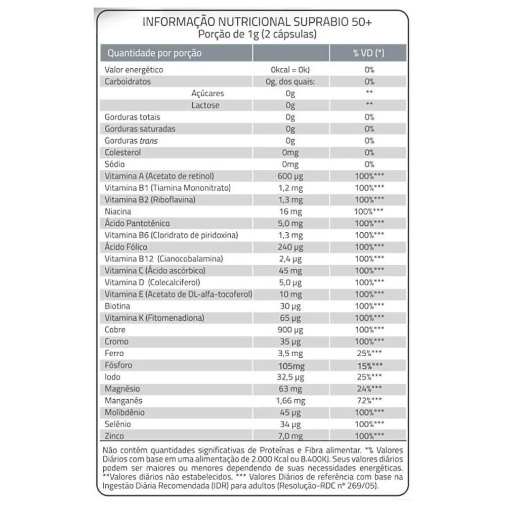 Fosfato de cálcio, Óxido de magnésio, vitamina c revestida, dl-alfa-acetato de tocoferol, Nicotinamida, Pirofosfato de ferro, Óxido de zinco, Sulfato de manganês, Fitomenadiona, vitamina a acetato, Pantotenato de cálcio, Vitamina B12, Sulfato de cobre, Vitamina D3, Biotina, Riboflavina, Cloridrato de piridoxina, Molibdato de sódio, Tiamina mononitrato, Selenito de sódio, Iodeto de potássio, Ácido fólico, Picolinato de cromo. Estabilizante: Celulose Microcristalina (INS 460i). Antiumectante: Dióxido de silício (INS 551). Lubrificante: Estearato de magnésio (INS 471iii). Gelificante: gelatina (INS 428). Acidulante: Ácido acético (INS 260). Corantes: Dióxido de titânio (INS 171), Azorubina (INS 122), Azul brilhante (INS 133) e Amarelo quinoleína (INS 104). Ingestão Recomendada