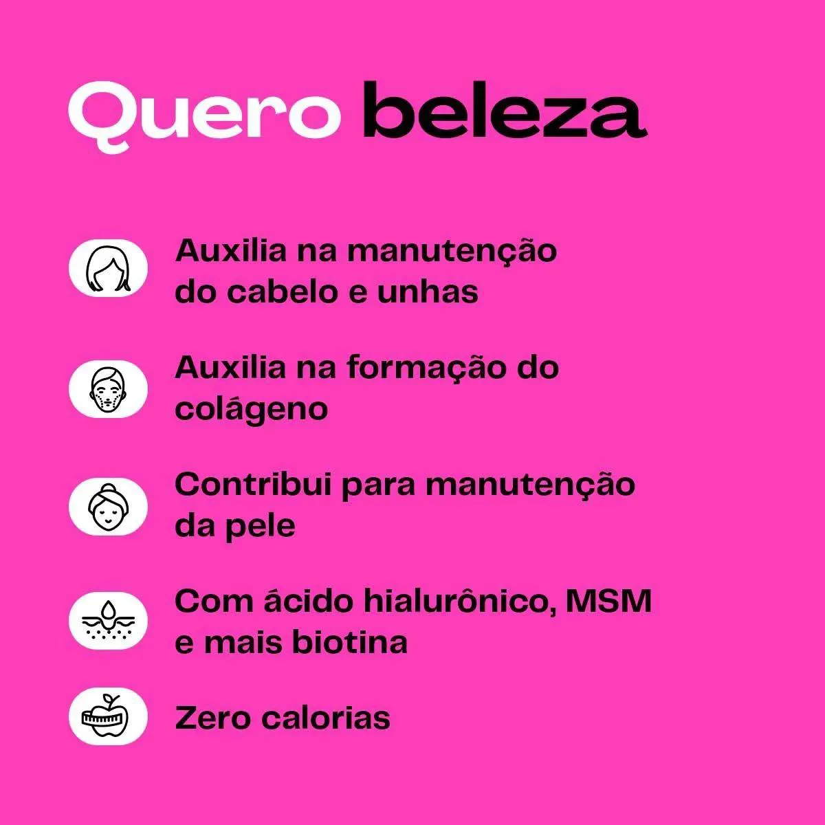 O que é e para que serve o Polivitamínico Vitamine-se Quero Beleza?O Vitamine-se Quero Beleza é um suplemento alimentar formulado com a combinação de ingredientes que promovem a beleza e saúde da pele, cabelos e unhas. Esse suplemento conta com três componentes essenciais: Ácido Hialurônico, 45 mcg de Biotina e MSM (metil sulfonil metano), além de Cisteína, Zinco e mais 13 ativos.