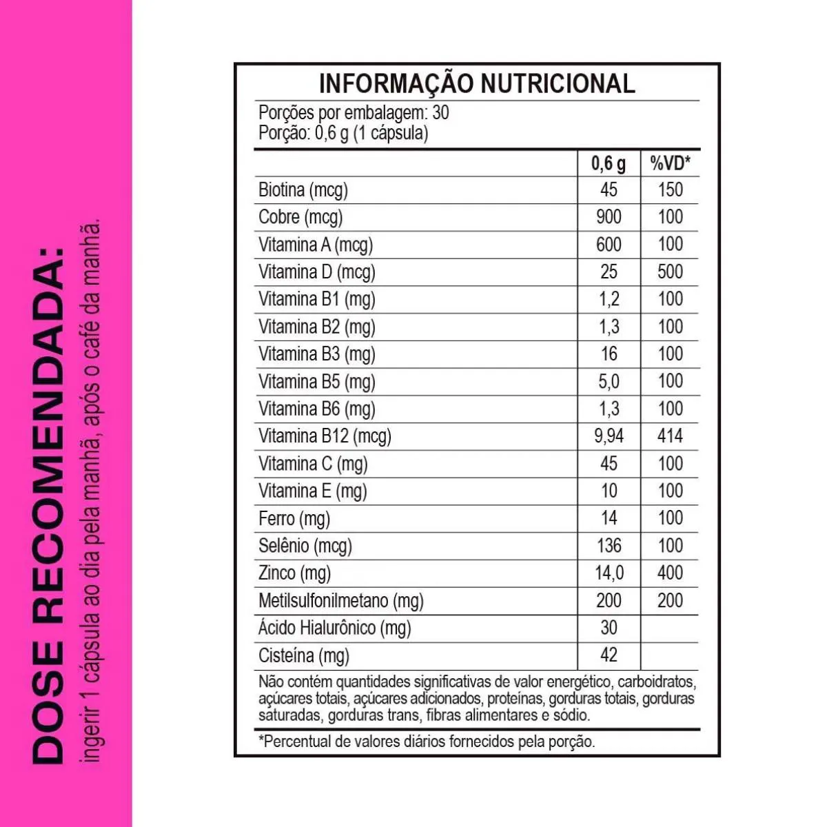 - Contém Ácido Hialurônico, 45 mcg de Biotina e MSM.