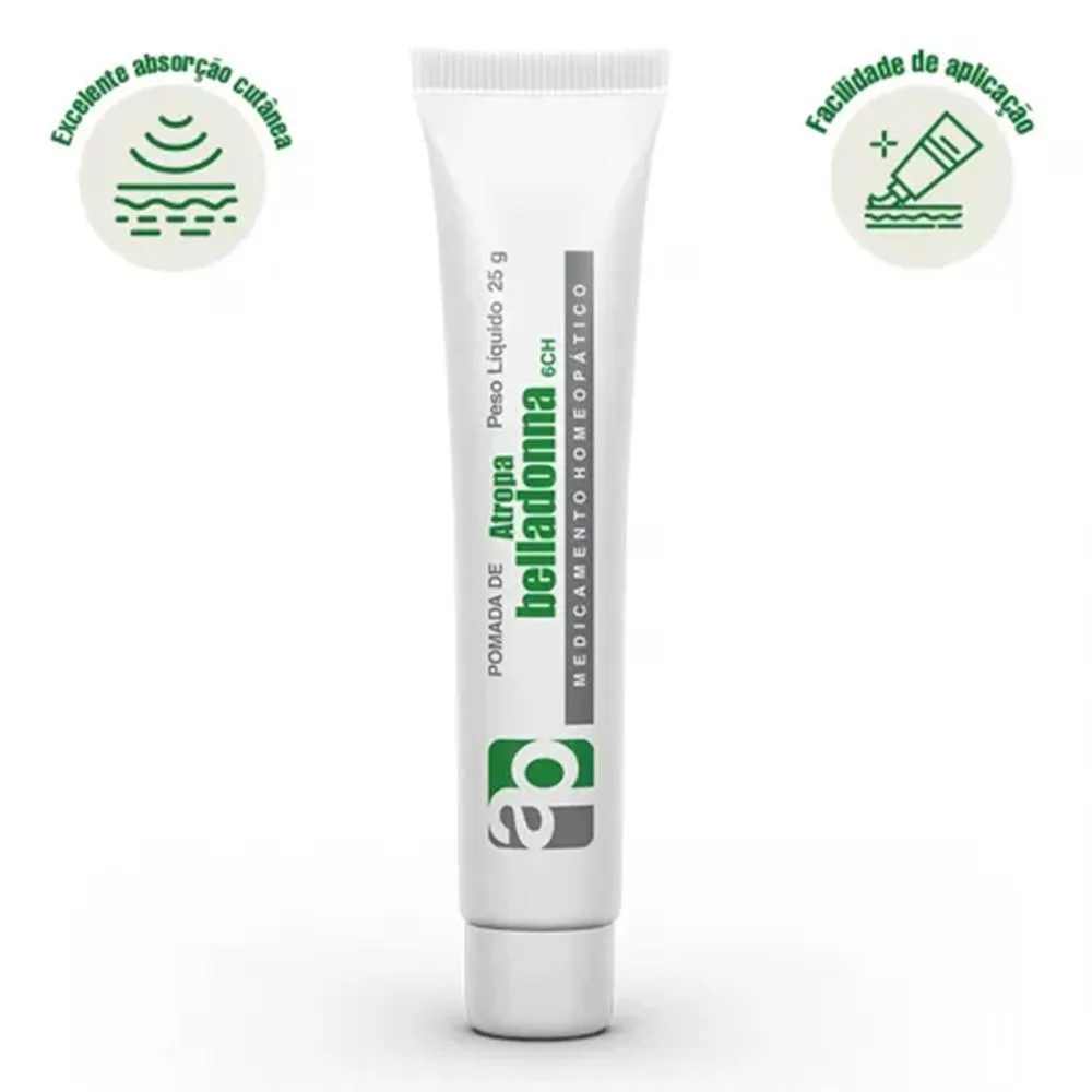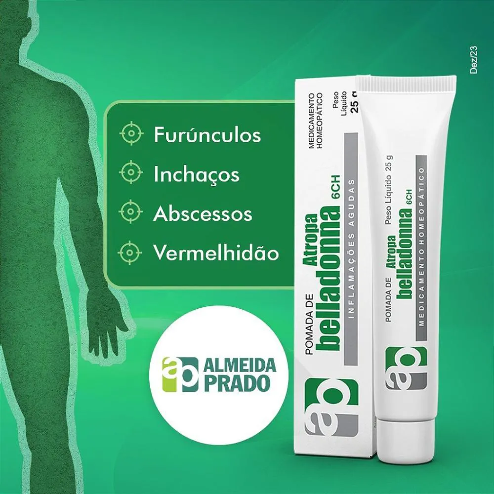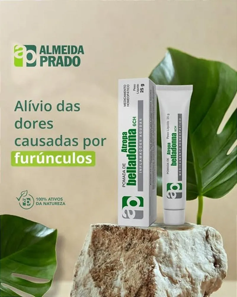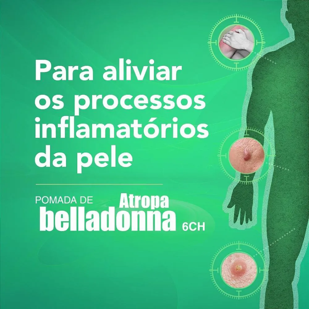 Auxiliar no tratamento dos sintomas das inflamações agudas, tais como: furúnculos, edemas ou inchaços, abscessos e outras inflamações que causam vermelhidão, brilho e/ou calor na pele. A POMADA DE ATROPA BELLADONNA é um medicamento que contém compostos chamados alcaloides,, que possuem propriedades medicinais, que bloqueiam as ações do sistema nervoso autônomo e contribuem para o alívio da dor. Considerado um importante ingrediente ativo da natureza, a ATROPA BELLADONNA estimula apenas reações benéficas do organismo, proporcionando bem-estar e ajudando nos quadros dolorosos das inflamações de pele. ATIVOS: Pomada de Atropa belladonna 6CH BENEFÍCIOS: Alívio no processo inflamatório da pele