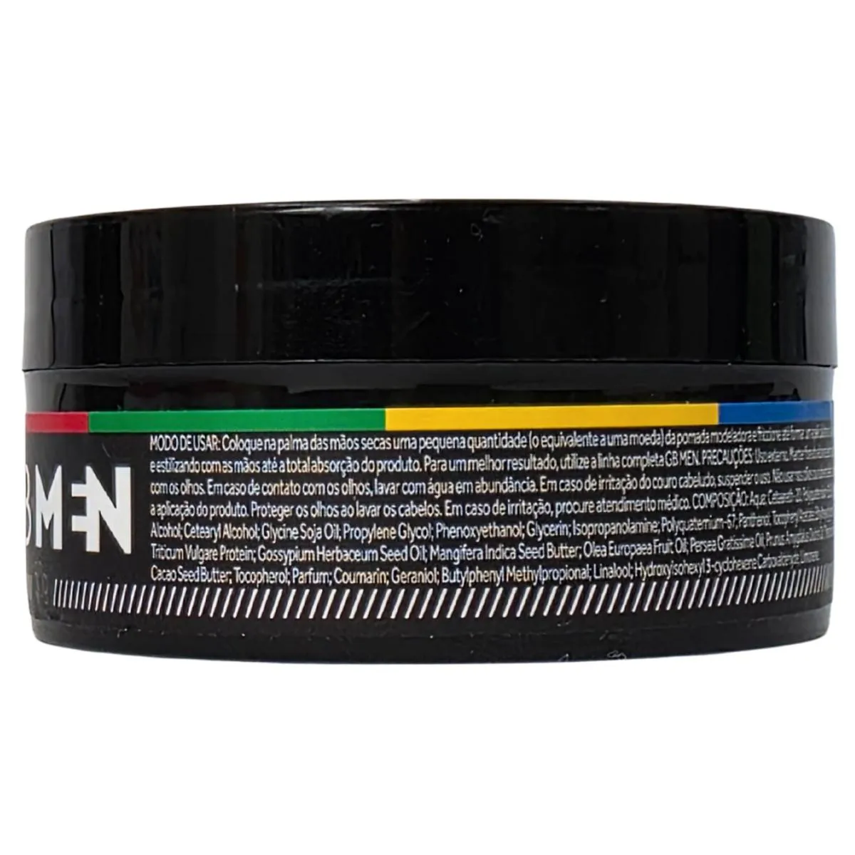 Modo de Uso: Coloque na palma das mãos secas uma pequena quantidade (o equivalente a uma moeda) da pomada modeladora e friccione até formar uma película branca. Aplique, esculpindo e estilizando com as mãos até a total absorção do produto. Para um melhor resultado, utilize a linha completa GB Men.