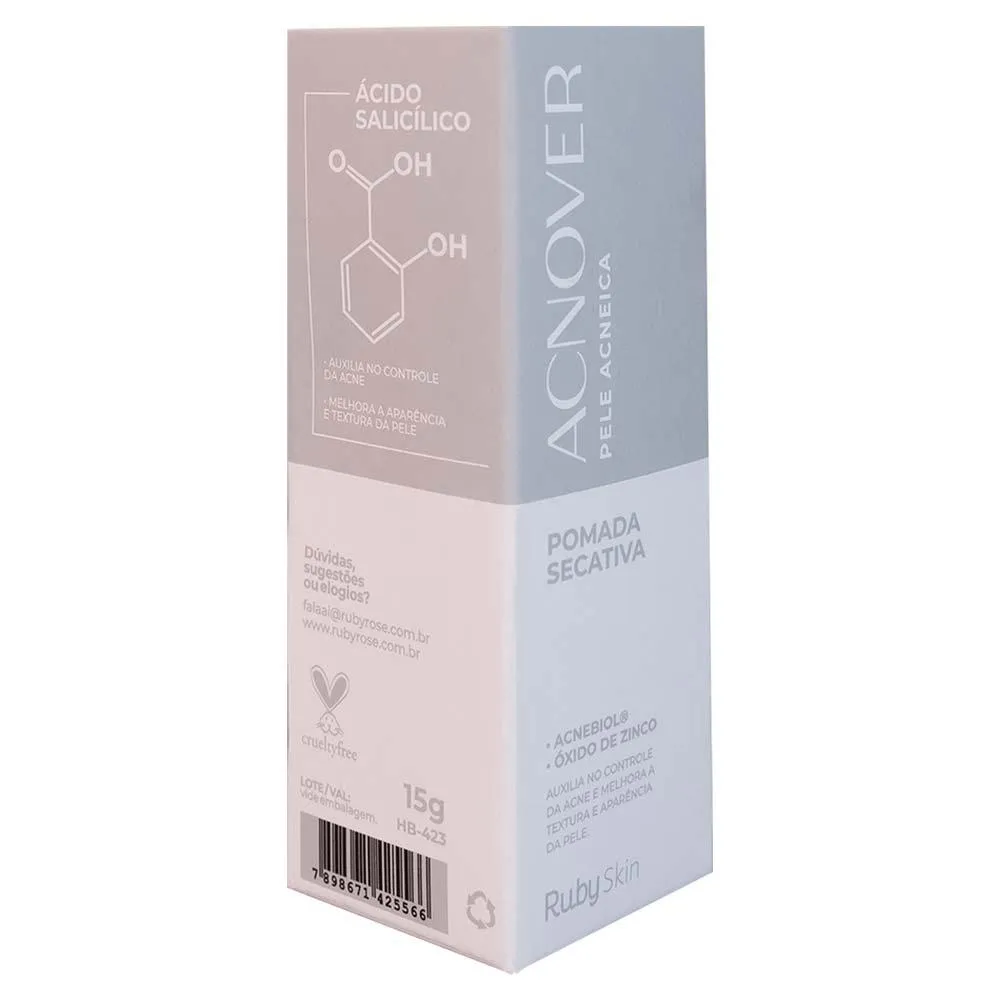 A Pomada Secativa Acnover foi desenvolvida especialmente para acne, desenvolvida com Complexo Bio-Normalizador composto por Ácido Salicílico, Salicilato de Dimetilsilanodiol, Acetilmetionato de Zinco, Extratos de Aloe e Pepino, Extrato de Lúpulo e Limão, Pantenol, Óxido de Zinco.