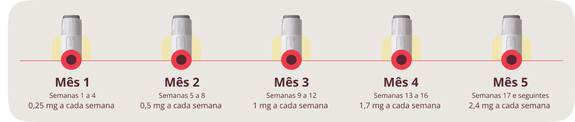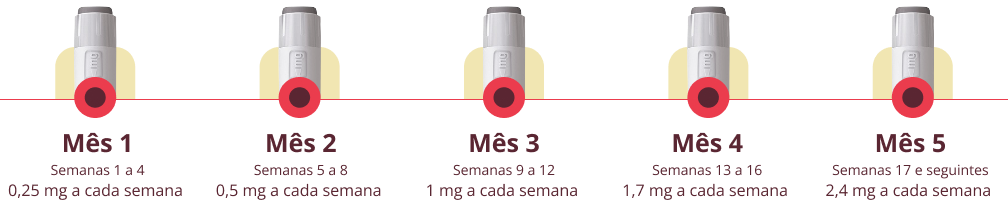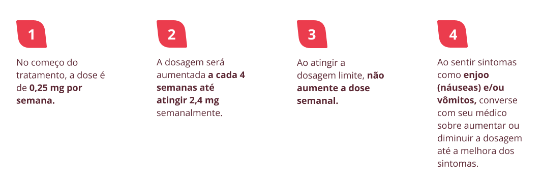 Em adultos, é recomendada a dose de 2,4 mg uma vez por semana. O tratamento tem início com uma dose menor, aumentada gradativamente nas 16 semanas seguintes, chegando a 2,4 mg uma vez por semana, conforme orientação médica.