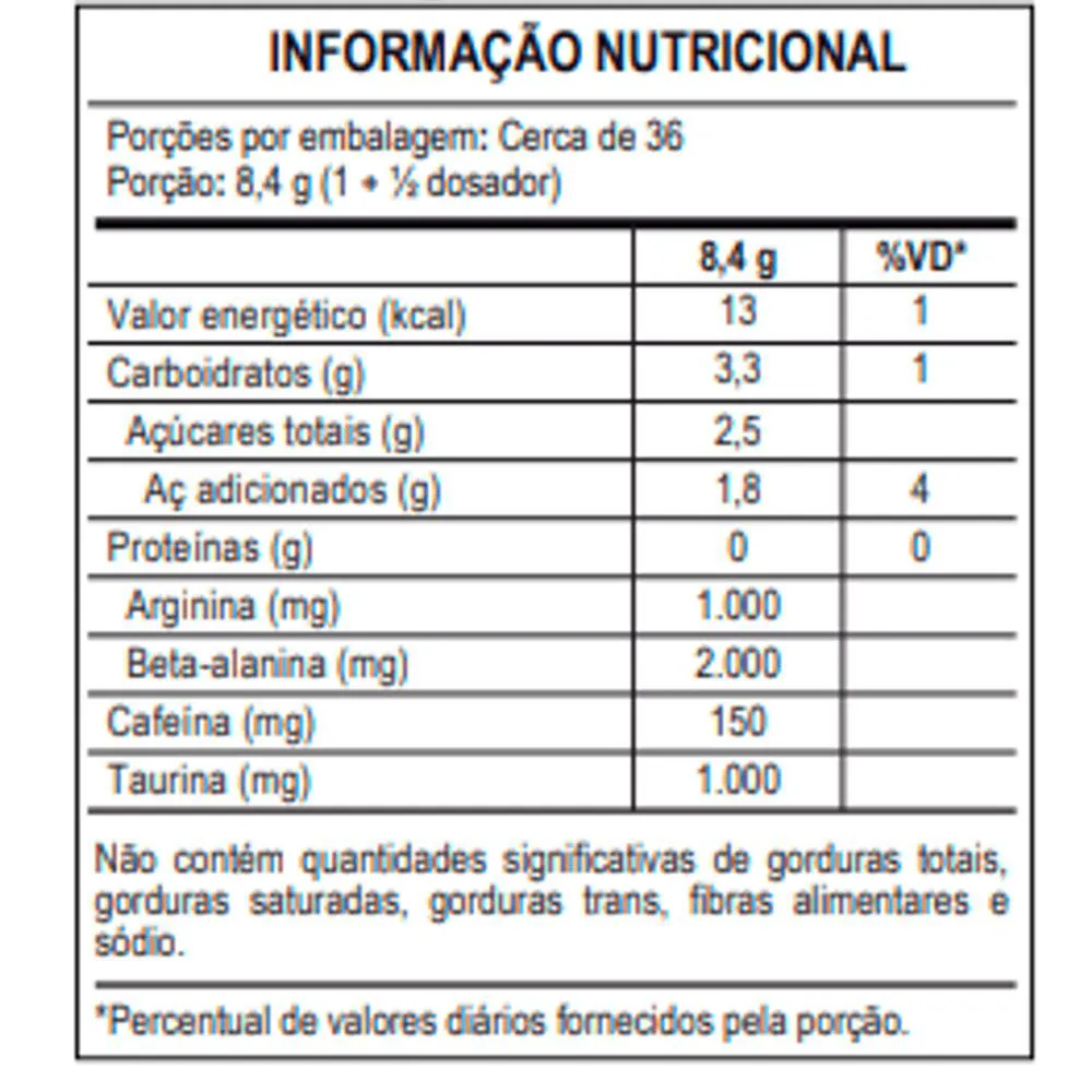 Beta Alanina: É um aminoácido não proteogênico, ou seja, não participa das vias de síntese proteica. Sua principal função é o aumento de Carnosina Muscular. Durante a prática de exercícios de elevada intensidade, acontece grande produção e acúmulo de ácido (H+) nos músculos, sendo essa uma das principais causas da fadiga. A neutralização desses ácidos é realizada pela Carnosina, uma molécula formada a partir da união dos aminoácidos beta-alanina e histidina.OBSERVAÇÃO: Um efeito muito conhecido para o consumo da Beta Alanina é a parestesia em doses completas, ou seja, aquela sensação de formigar/pinicar.Destaques Hórus Max Titanium 150 mg de Cafeína; 1000 mg Arginina; 1000 mg Taurina; 2000 mg Beta Alanina; Zero Glúten; Zero Lactose;