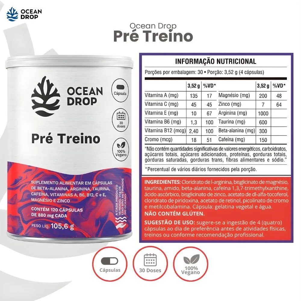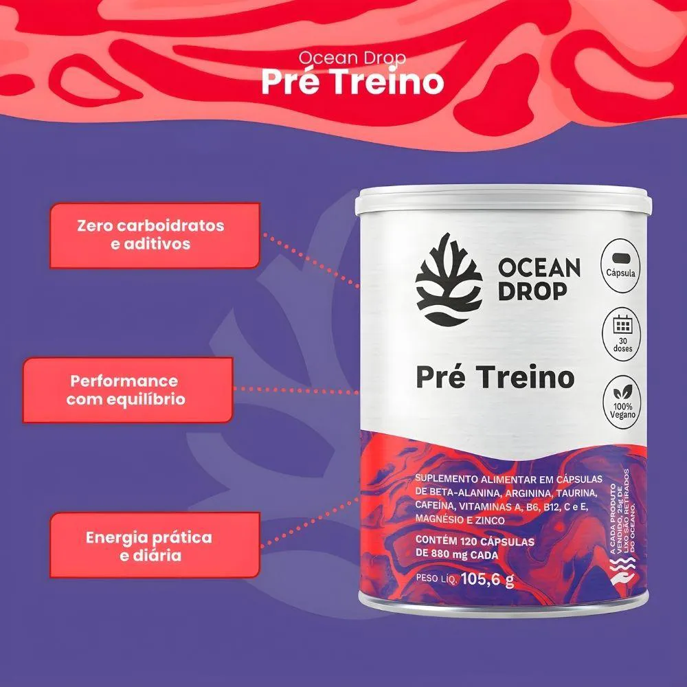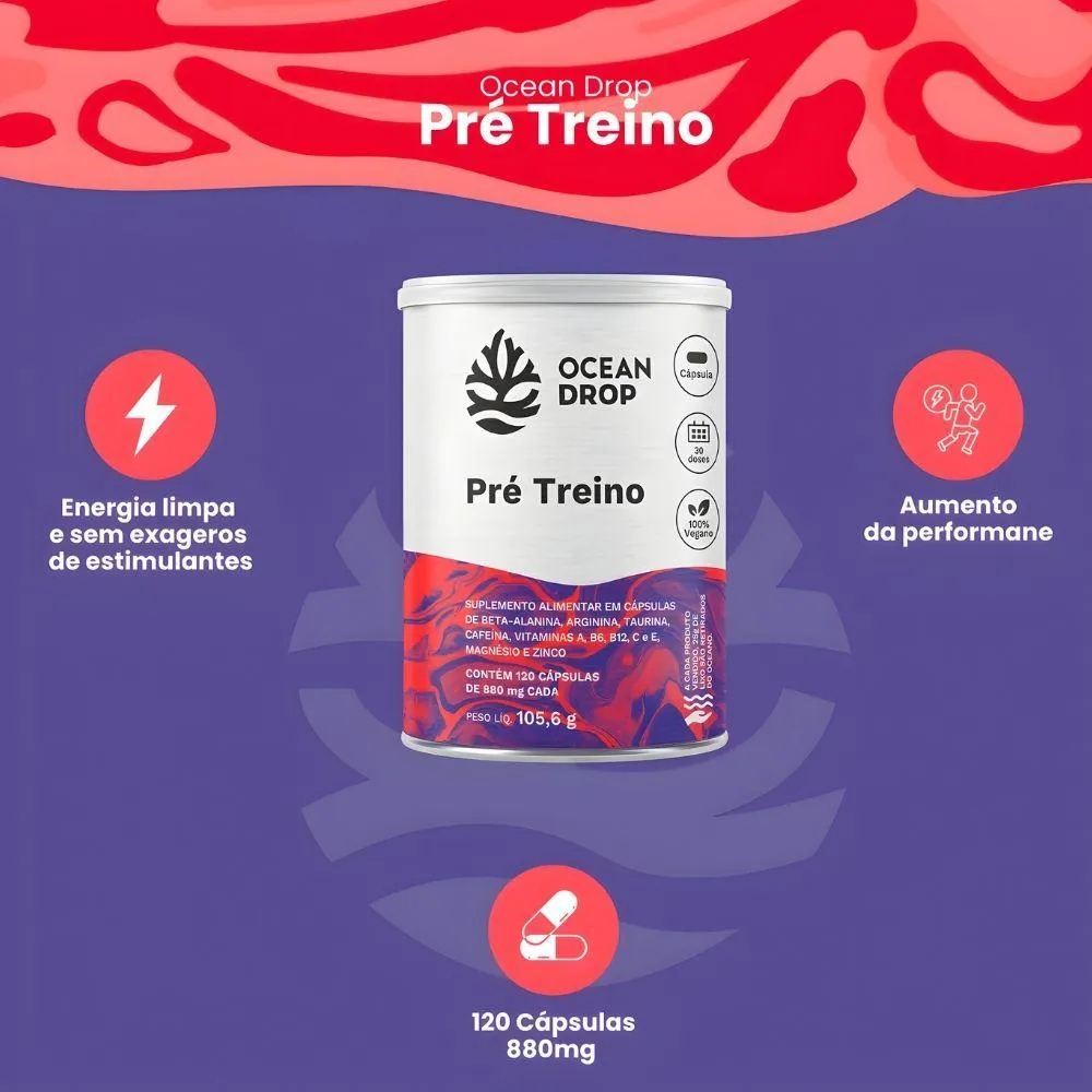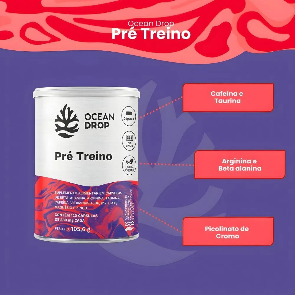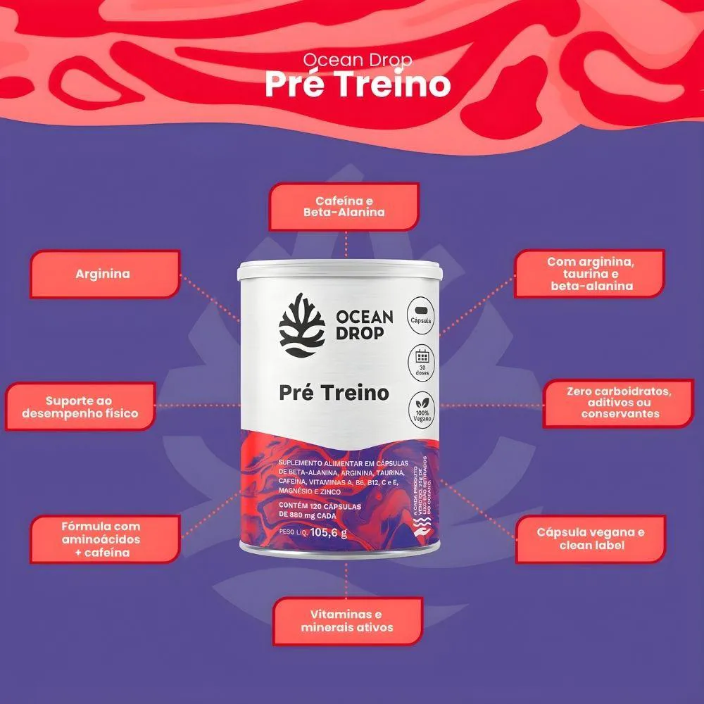 Pré-Treino – Ocean Drop O Pré-Treino da Ocean Drop é um suplemento alimentar desenvolvido para complementar a rotina de treinos e atividades físicas. É indicado para pessoas que buscam mais disposição e foco antes do exercício, fazendo parte de um estilo de vida ativo e equilibrado. Apresentado em cápsulas, oferece praticidade no consumo diário e pode ser utilizado antes do treino conforme a necessidade individual. Benefícios do produto: