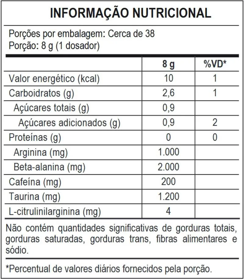 Sua composição estratégica conta com ingredientes de altíssima qualidade, como cafeína anidra, beta-alanina, taurina e arginina, que juntos promovem uma verdadeira revolução na sua performance: