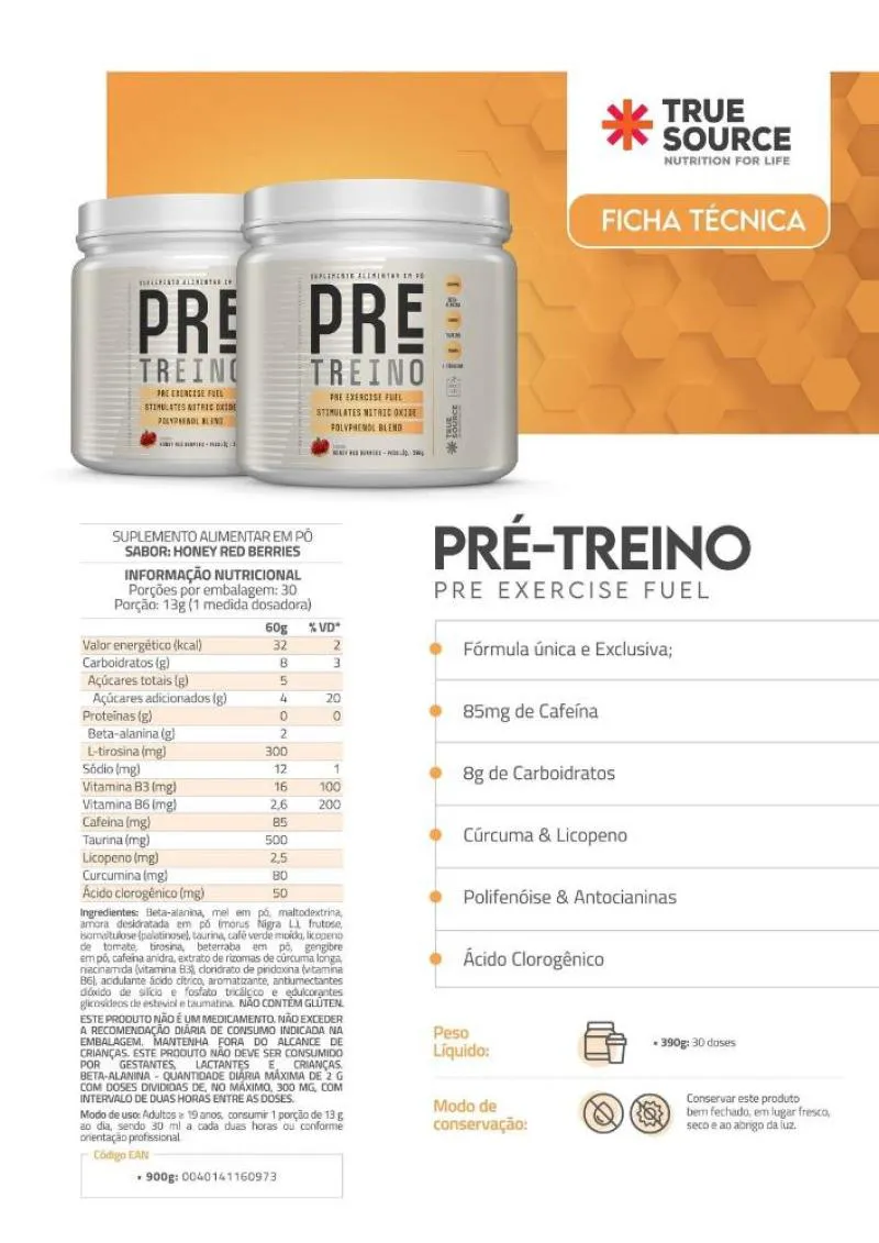 ✔ Cafeína – aumento de performance e concentração Transforme seus treinos com o Pre Treino True Honey Red Berries Ginger e alcance o máximo do seu potencial atlético!