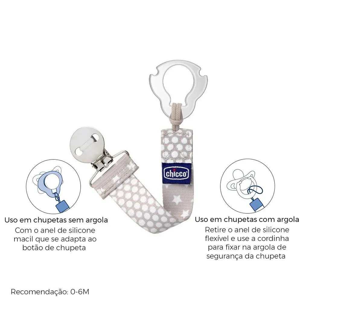 - Anel de silicone macio que se adapta perfeitamente ao botão da chupeta, proporcionando conforto.