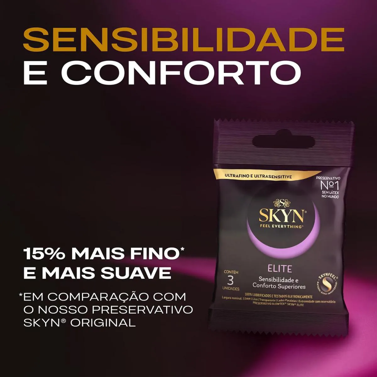 O que é a camisinha Blowtex Skyn Elite?Blowtex Skyn Elite é a camisinha mais fina da linha Skyn, sendo 20% mais fina que a versão Skyn Original e feita com tecnologia SkynFeel (poliisopreno), que traz um material mais macio e sensitivo. Livre de látex de borracha natural, é uma opção ideal para quem tem problemas de pele e alergias a este material.