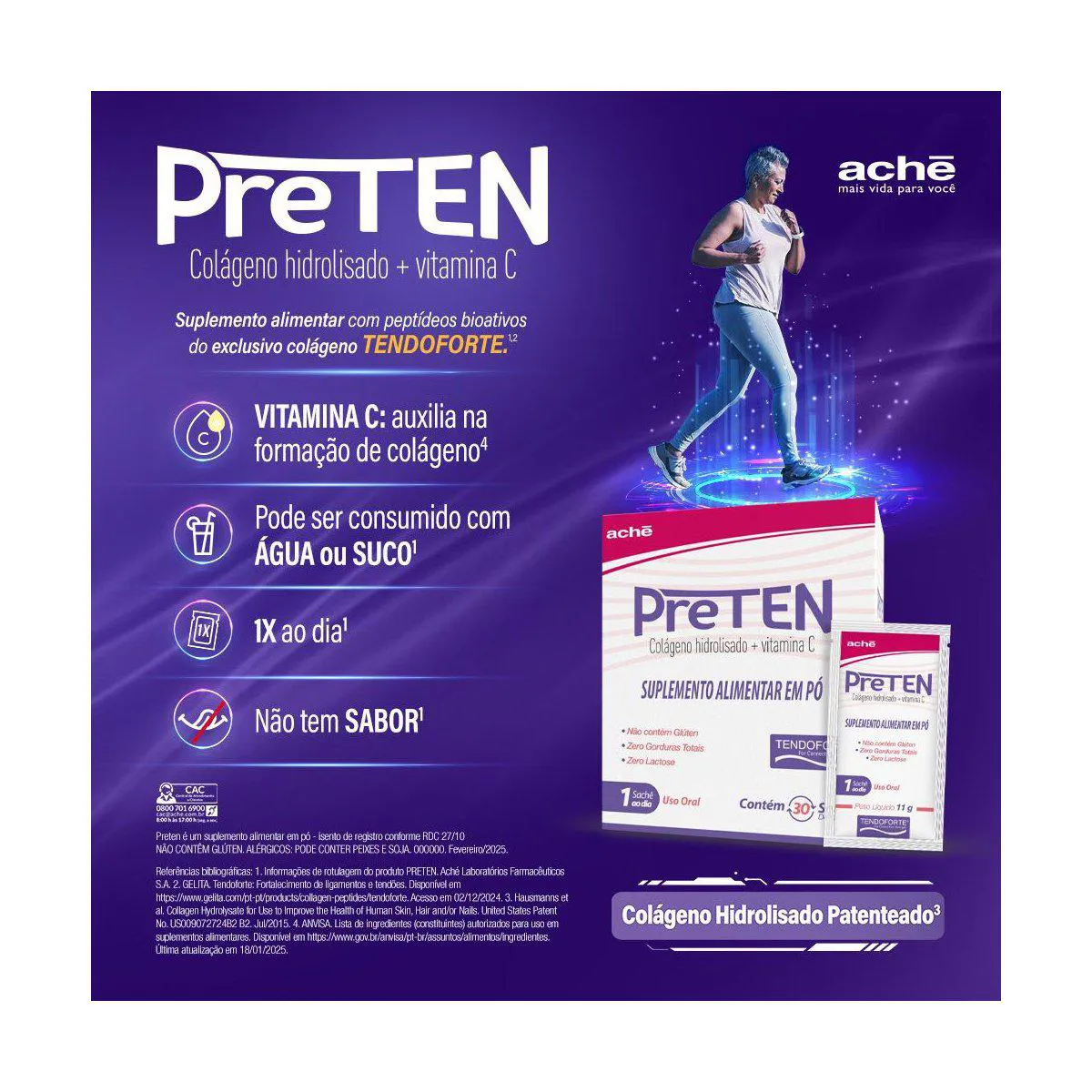 Preten é um suplemento alimentar em pó composto por colágeno Hidrolisado e vitamina c.