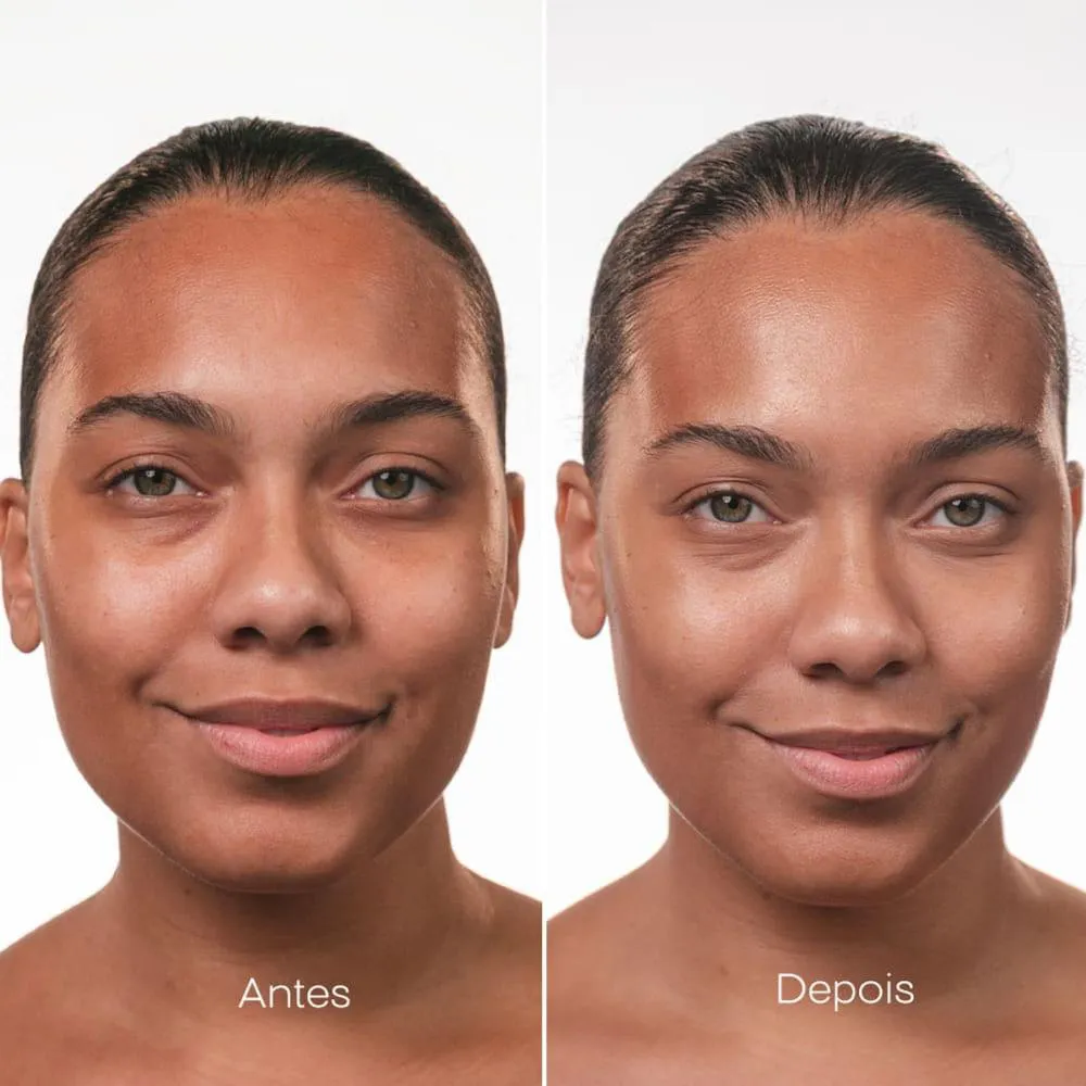 Ele atua como um primer, uniformizando o tom da pele com um efeito desfocado, sem marcar linhas de expressão, enquanto ilumina intensamente o rosto.