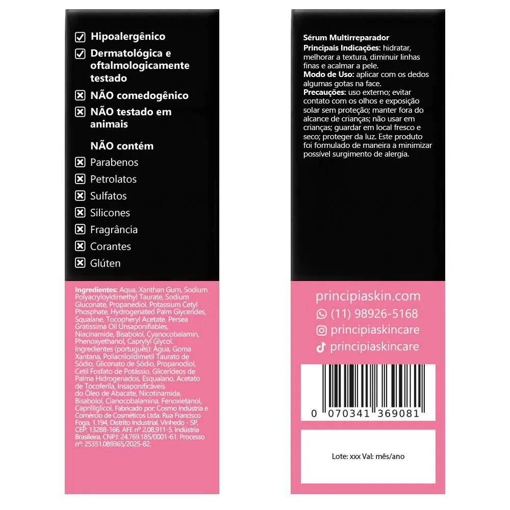 Kti com três produtos: Sérum multirreparador com 6% de multivitaminas, 3% de manteiga de abacate, 2% de esqualano e 1% de bisabolol, proporciona hidratação intensa, ajuda a suavizar linhas finas, melhora a textura e acalma a pele, gel de limpeza com 9,5% de mix de tensoativos, 30% de glicerina e 1% de extrato de algodão, melhora da hidratação, maciez e viço. Indicado para peles sensíveis e secas e creme com 17,5% de mix de ativos com propriedades hidratantes, calmantes e reparadoras para melhora do ressecamento, irritação, vermelhidão, ardência e descamação da pele.