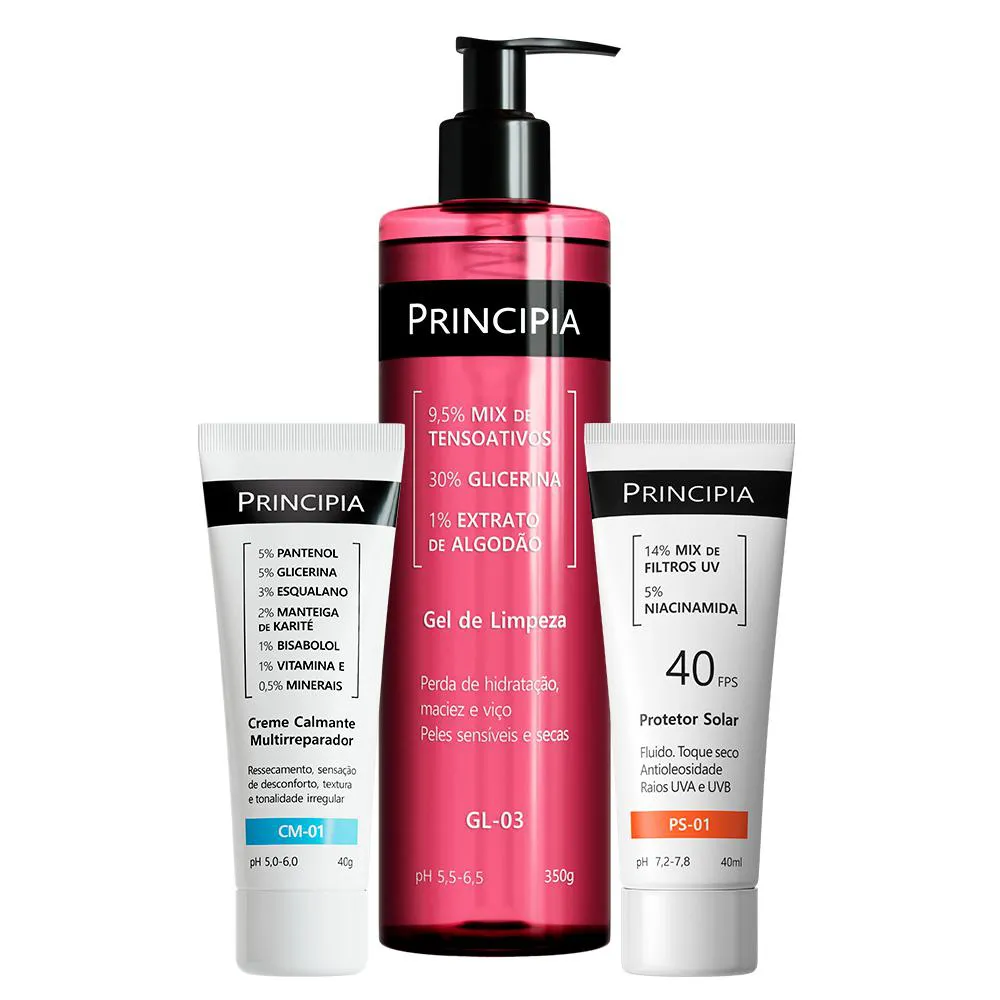 Kit com três produtos para cuidados diários para pele sensível e seca: Gel de limpeza com 9,5% de mix de tensoativos, 30% de glicerina e 1% de extrato de algodão, melhora da hidratação, maciez e viço. Indicado para peles sensíveis e secas, um creme com 17,5% de mix de ativos com propriedades hidratantes, calmantes e reparadoras para melhora do ressecamento, irritação, vermelhidão, ardência e descamação da pele e um protetor solar fluido antioleosidade com 14% de filtros UV e 5% de niacinamida, FPS 40, toque seco e eficácia contra raios UVA e UVB, luz visível e azul.