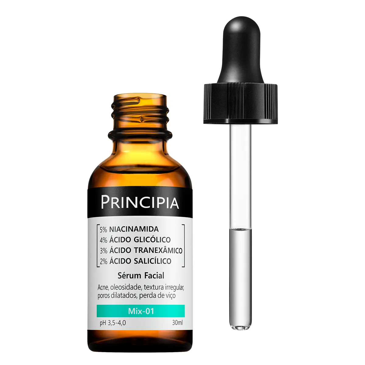 Ideal para todos os tipos de pele, o Mix-01 Principia Skincare é um sérum facial antiacne composto por mix de 4 ativos: 5% de niacinamida, 4% de ácido glicólico, 3% de ácido tranexâmico e 2% de ácido salicílico.