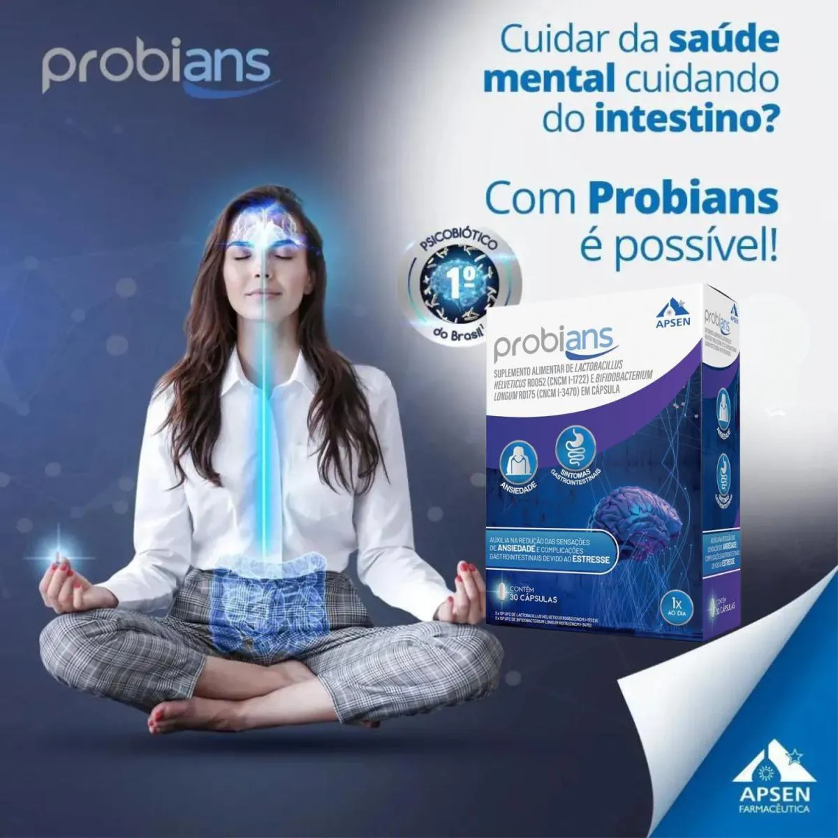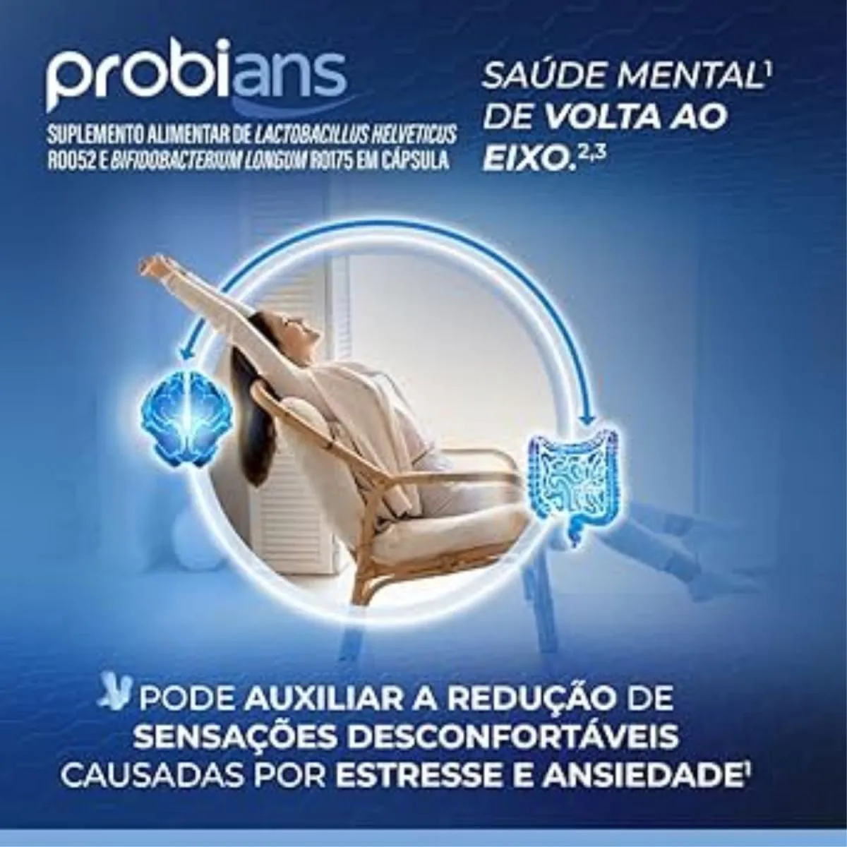Probians é um probiótico avançado que atua no eixo intestino-cérebro, unindo o poder das cepas Lactobacillus helveticus R0052 e Bifidobacterium longum R0175.