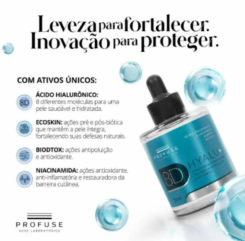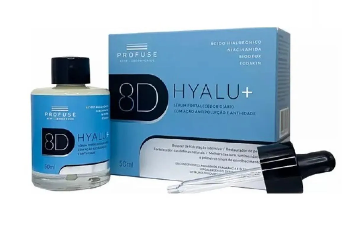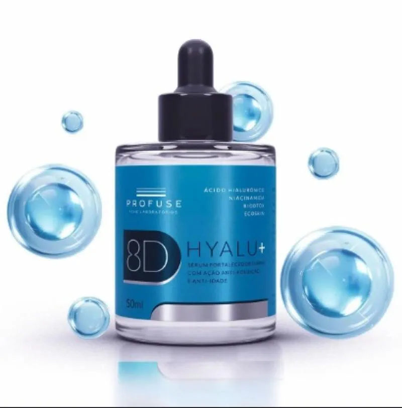 8D Hyalu + Sérum Facial Anti-Idade 50ml - Profuse Com uma fórmula completa, 8D Hyalu+ é um sérum facial com ação fortalecedora, antipoluição e antirrugas. Sua fórmula robusta possui Niacinamida, com ação antioxidante e ajuda na melhora da textura da pele, Ecoskin, com ações pré e pós-biótica que fortalecem a pele e suas defesas naturais, e BioDtox para proteção contra os radicais livres causados pela poluição. Seu principal diferencial está nos 8 tipos de ácido hialurônico com diversos pesos moleculares (Moistshield™ HA) que oferecem um booster de hidratação.