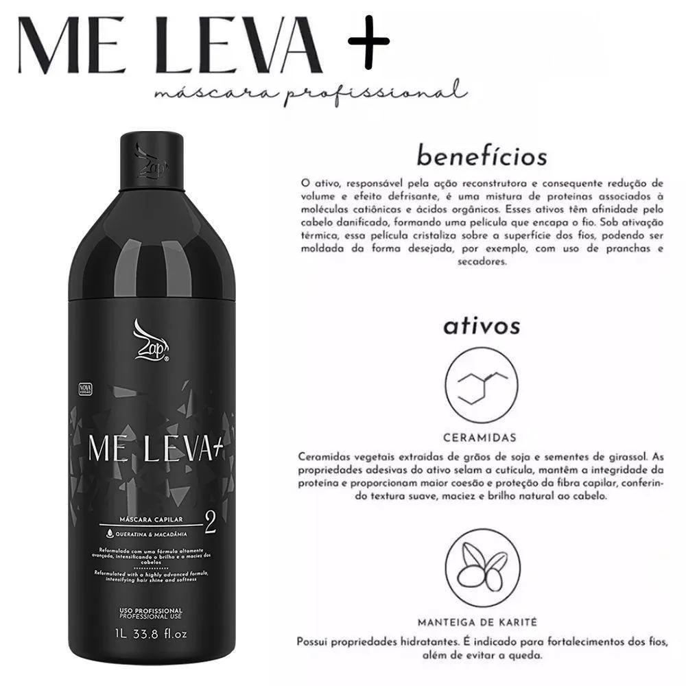 A escova Progressiva Me Leva Black Passo 2 é um tratamento capilar desenvolvido para proporcionar alisamento eficaz e cuidado intensivo aos fios danificados. Formulada com ingredientes de alta qualidade, sua composição inclui:?Óleo de Macadâmia e Óleo de Coco: nutrem profundamente os cabelos, devolvendo os nutrientes perdidos, promovendo brilho intenso, maciez e alinhamento dos fios, sem deixá-los pesados ou oleosos.?Aloe Vera: possui enzimas que removem células mortas, proporcionando hidratação profunda aos fios.?Ceramidas: extraídas de grãos de soja e sementes de girassol, mantêm a integridade da proteína capilar, conferindo textura suave, maciez e brilho natural.?Sericina: proteína derivada da seda que, ao se ligar com a queratina, forma um filme natural protetor nos cabelos, deixando-os mais sedosos.Este produto é ideal para quem busca cabelos lisos, hidratados e com aspecto natural. A aplicação deve ser realizada por um cabeleireiro, seguindo as instruções fornecidas para garantir resultados satisfatórios. Além disso, a Escova Progressiva Me Leva Black é com outros processos químicos e permite que os cabelos sejam lavados imediatamente após sua aplicação.Observações Importantes:?Não recomendado para gestantes, lactantes e crianças.?Evitar o uso em clientes com couro cabeludo sensível, irritado ou ferido.?Realizar teste de mecha antes da aplicação completa.?A quantidade média a ser aplicada é de 50ml para cabelos de tamanho médio.Para obter melhores resultados e preservar a saúde dos fios, é essencial seguir as orientações de uso e cuidados pós-tratamento.ATENÇÃOAS IMAGENS SÃO MERAMENTE ILUSTRATIVAS E PODEM SOFRER VARIAÇÕES DE COR E PEQUENOS DETALHES DE ACORDO COM O SEU MONITOR, ILUMINAÇÃO DO AMBIENTE E ATÉ MESMO A SUA PERCEPÇÃO VISUAL.Progressiva Me Leva Black Máscara Passo 2