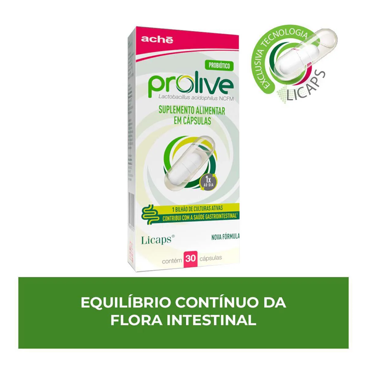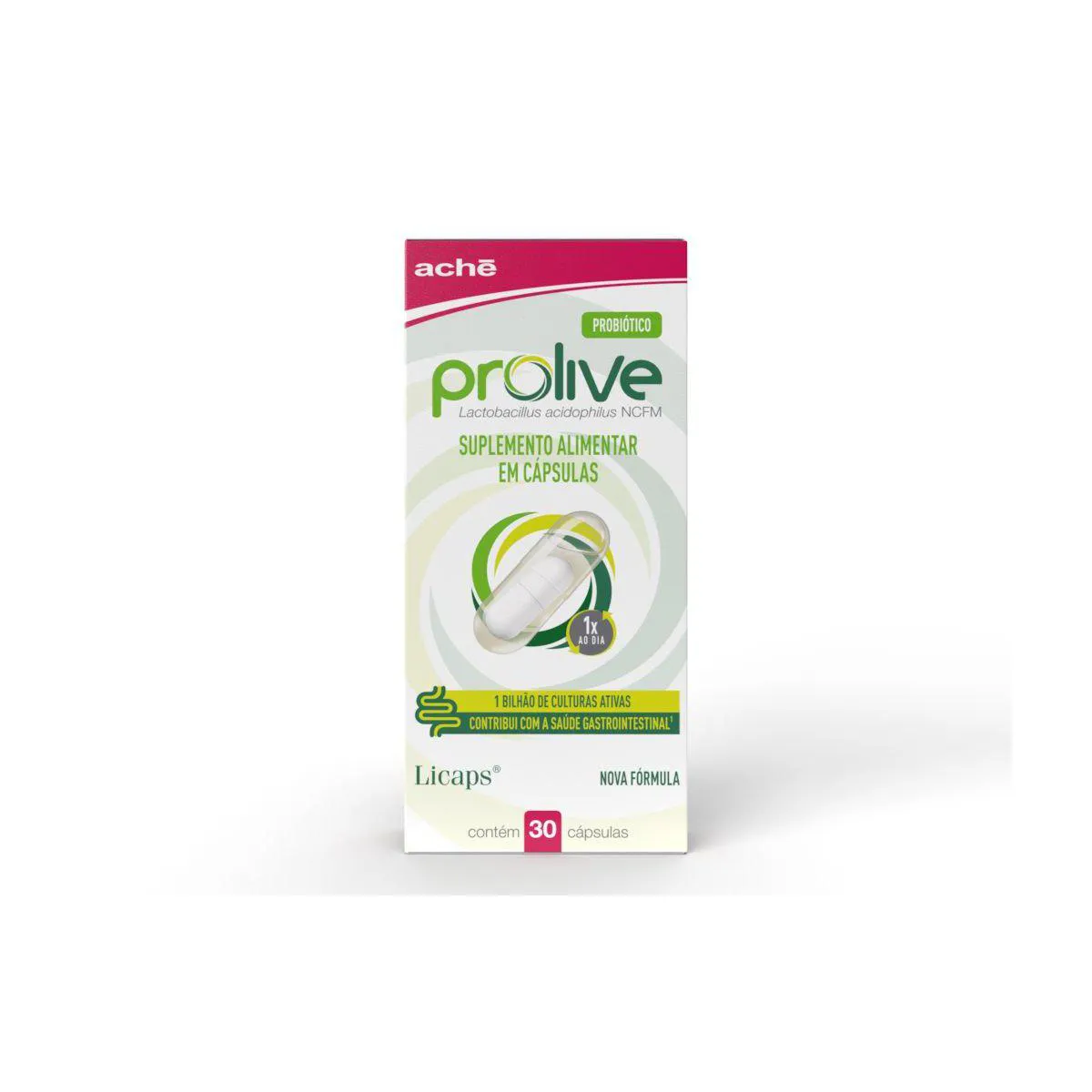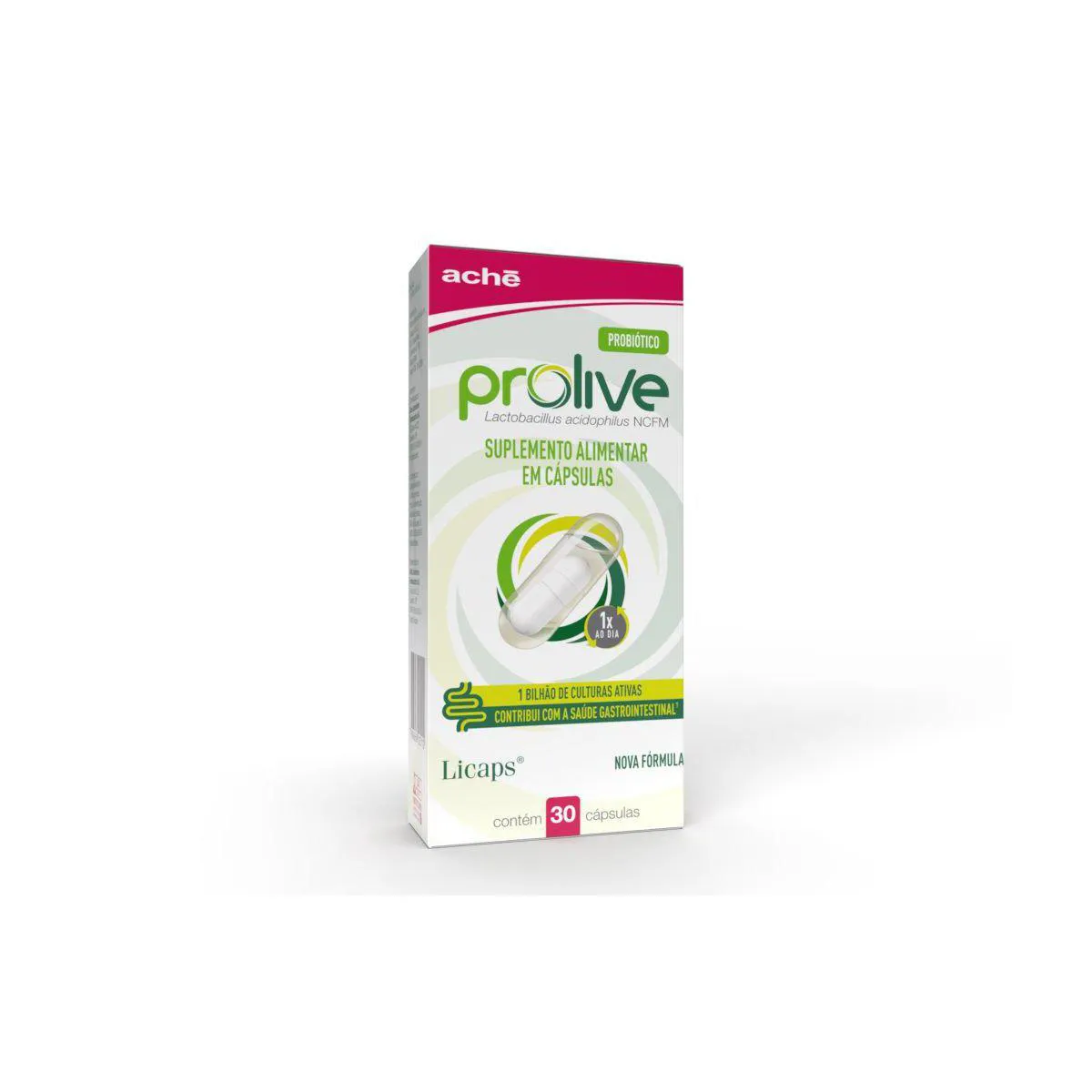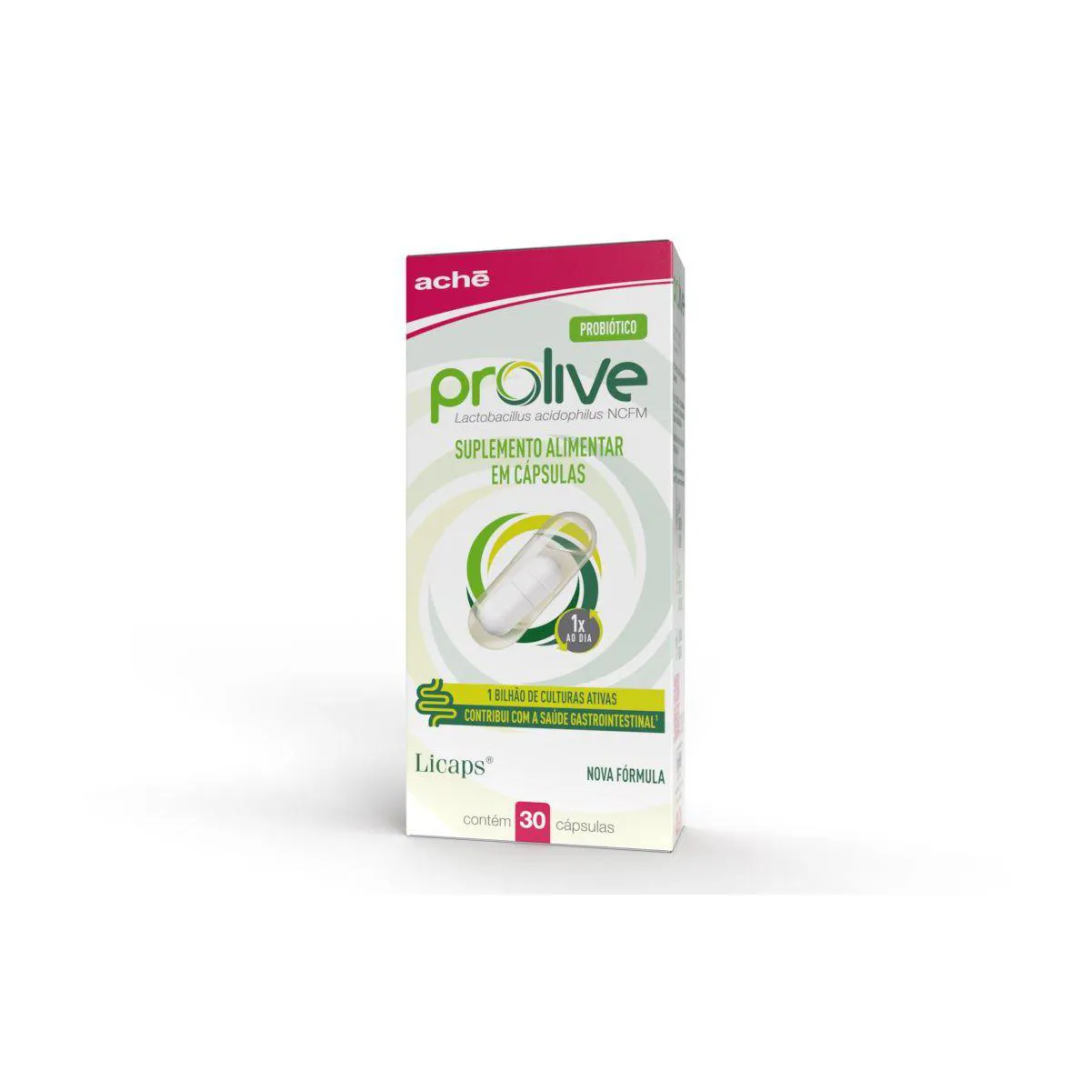 Prolive da Aché é uma probiótico em cápsulas, um alimento funcional indicado para melhorar o funcionamento e o equilíbrio da flora intestinal. Ele tem em sua composição o probiótico Lactobacillus acidophilus LA 14 e a exclusiva tecnologia Licaps, que protege o probiótico, garantindo que ele seja liberado diretamente no intestino, portanto sobrevivendo ao processo digestivo.