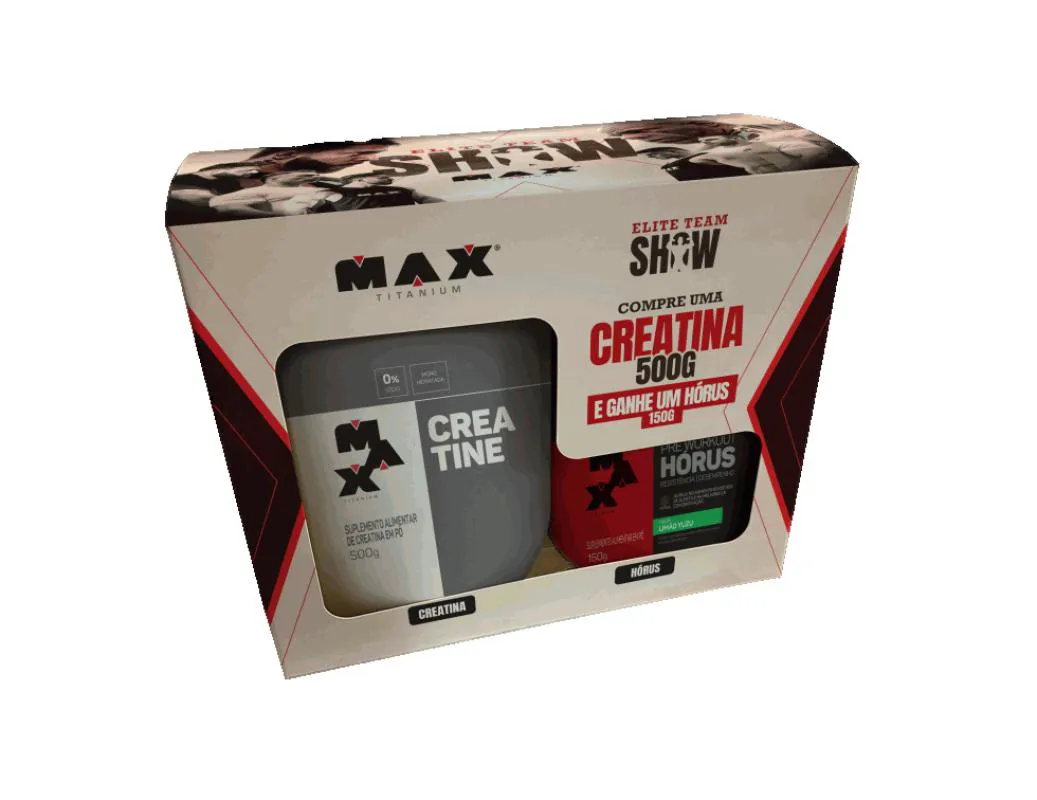 COMBO ELITE TEAM SHOW Potência e Performance no Seu Máximo Nível!Compre uma Creatina 500 g e ganhe um HÓRUS 150 g! CREATINA MAX TITANIUM (500 g)Creatina monohidratada de alta pureza e absorção.Aumenta força, potência e massa magra.0% sódio, sem glúten, direto da fábrica para sua casa. PRÉ-TREINO HÓRUS (150 g)Primeiro pré-treino brasileiro com Beta Alanina liberada pela ANVISA.Fórmula tecnológica para reduzir a fadiga e turbinar seu foco e resistência.Ingredientes premium que elevam seu rendimento ao máximo. Por que escolher o Combo Elite Team Show?Economia: leve dois suplementos topo de linha pagando apenas pela creatina.Resultados Rápidos: suporte energético completo da creatina + estímulo intenso do Hórus.