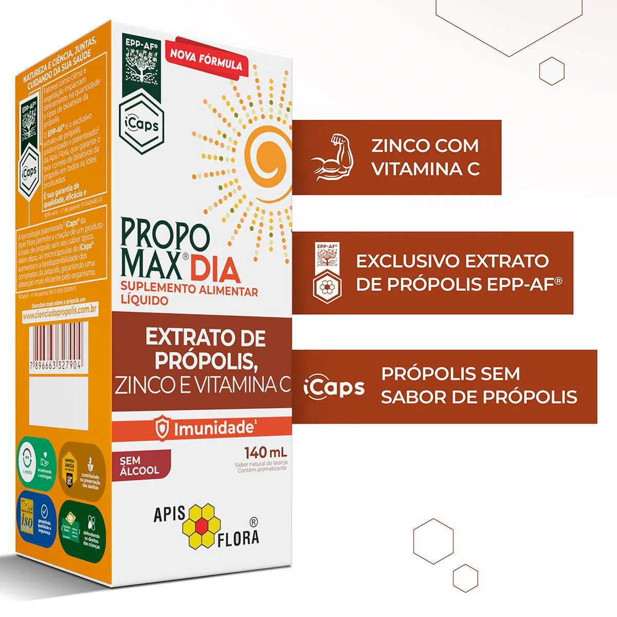 Indicado como auxiliar no fortalecimento da imunidade, Propomax Dia é um composto alimentar rico em Extrato de Própolis (seu ingrediente principal), vitamina c e Zinco.