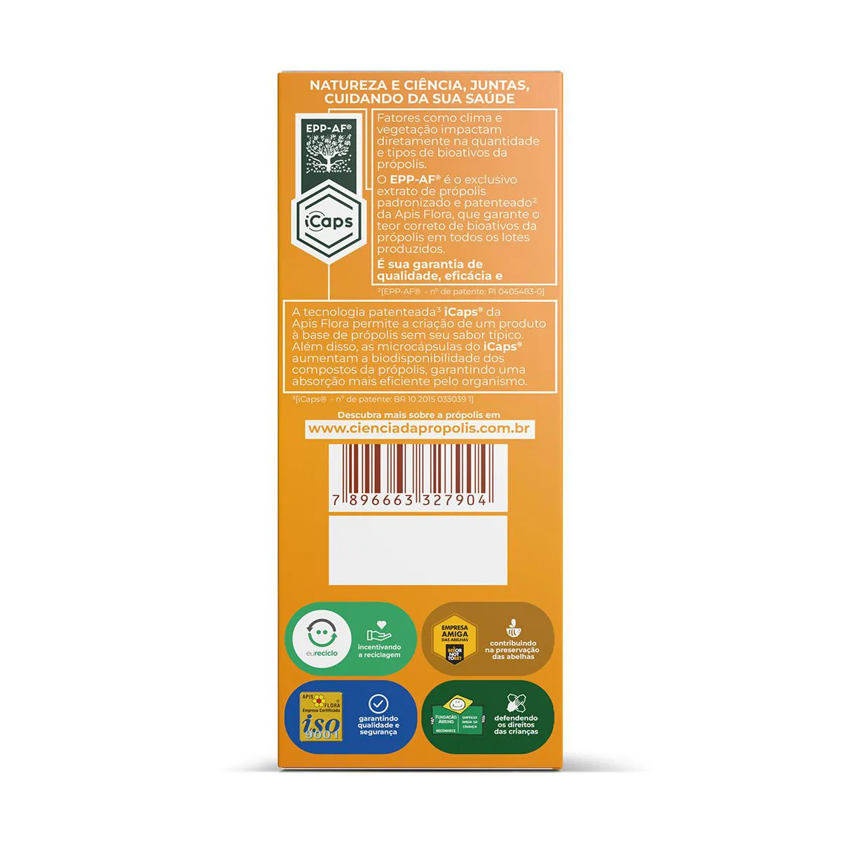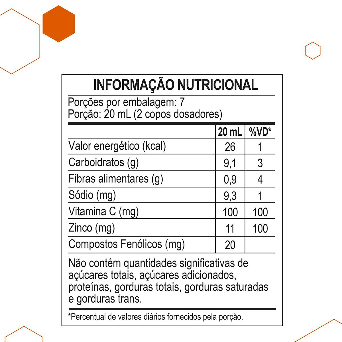 Água, extrato de própolis (EPP-AF®), ascorbato de cálcio (Vitamina C), sulfato de zinco monohidratado (Zinco), sorbitol (agente de massa), xilitol (edulcorante), goma arábica e goma xantana (espessantes) e óleo essencial de laranja doce - Citrus aurantium (aromatizante).