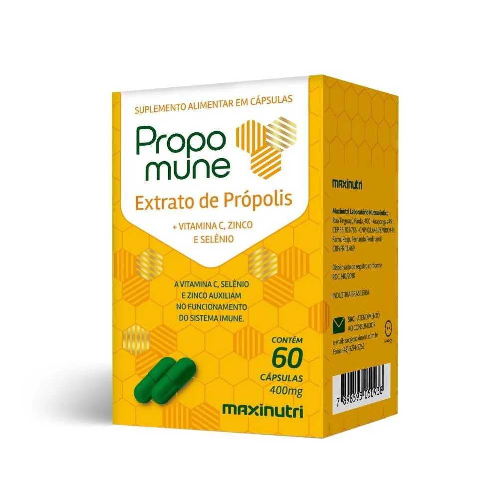 Propomune Extrato de Própolis 400mg 60 Cápsulas Maxinutri Ingredientes: Extrato de própolis, vitamina c, selênio e zinco, excipiente: silicato de magnésio, antiumectante: dióxido de silício, cápsula: gelatina e corantes: amarelo 10, amarelo 6, azorrubina, azul brilhante e dióxido de titânio. Não contém glúten. Sugestão de uso: Ingerir 2 cápsulas ao dia. Conservação: Conservar ao abrigo da luz, calor e umidade. Após aberto consumir em até 60 dias.