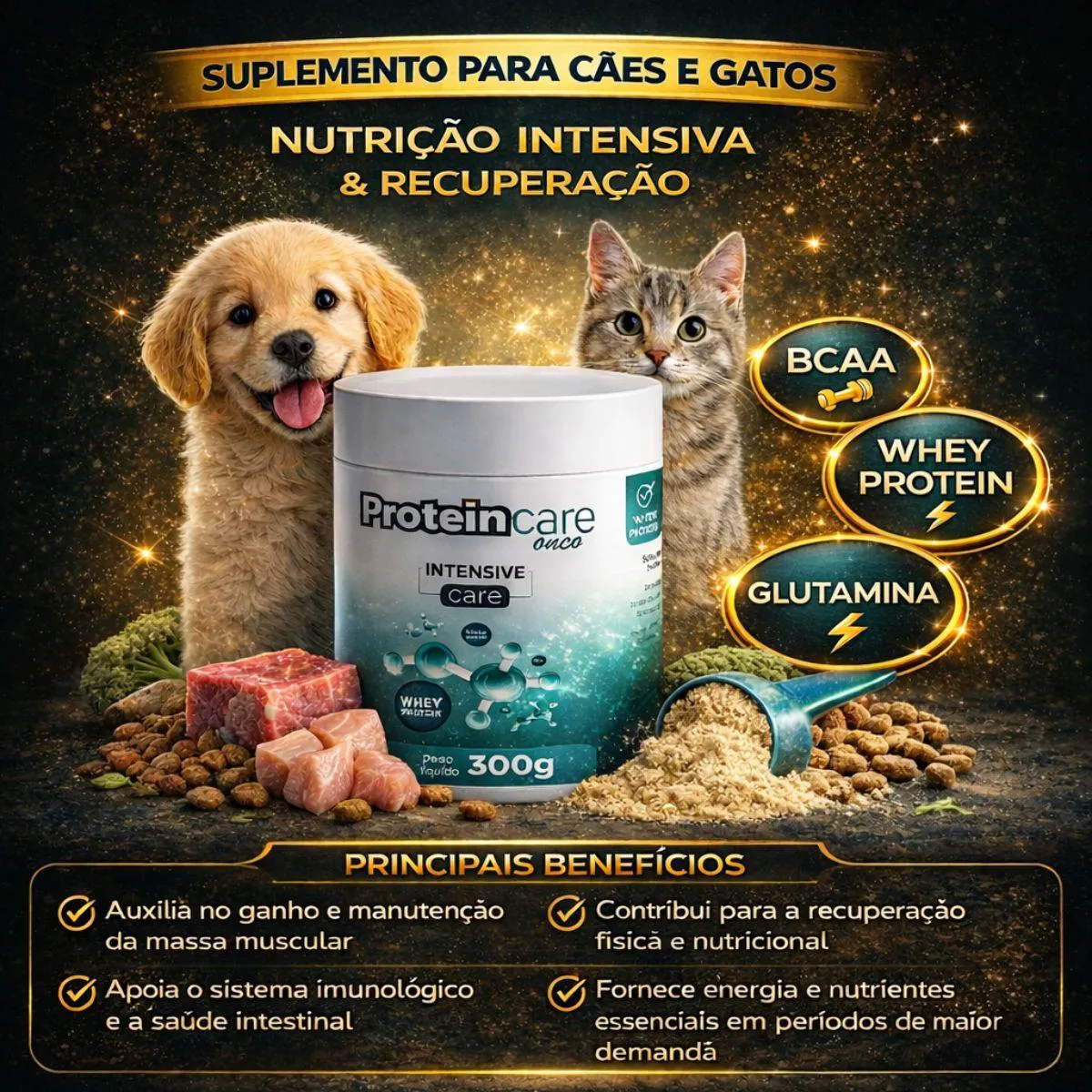 O Protein Care Onco Intensive Care é um suplemento alimentar de alta qualidade desenvolvido para cães e gatos, composto por carboidratos complexos, proteínas de alto valor biológico, óleos vegetais, aminoácidos essenciais, vitaminas e minerais. Possui alta palatabilidade e biodisponibilidade, sendo indicado para animais de qualquer porte ou raça a partir do desmame. Serve para fornecer nutrição completa, auxiliando no ganho e manutenção da massa muscular, recuperação física e nutricional, apoio ao sistema imunológico e fornecimento de energia em períodos de maior demanda, como para animais em crescimento, gestantes, atletas ou em processo de recuperação.
