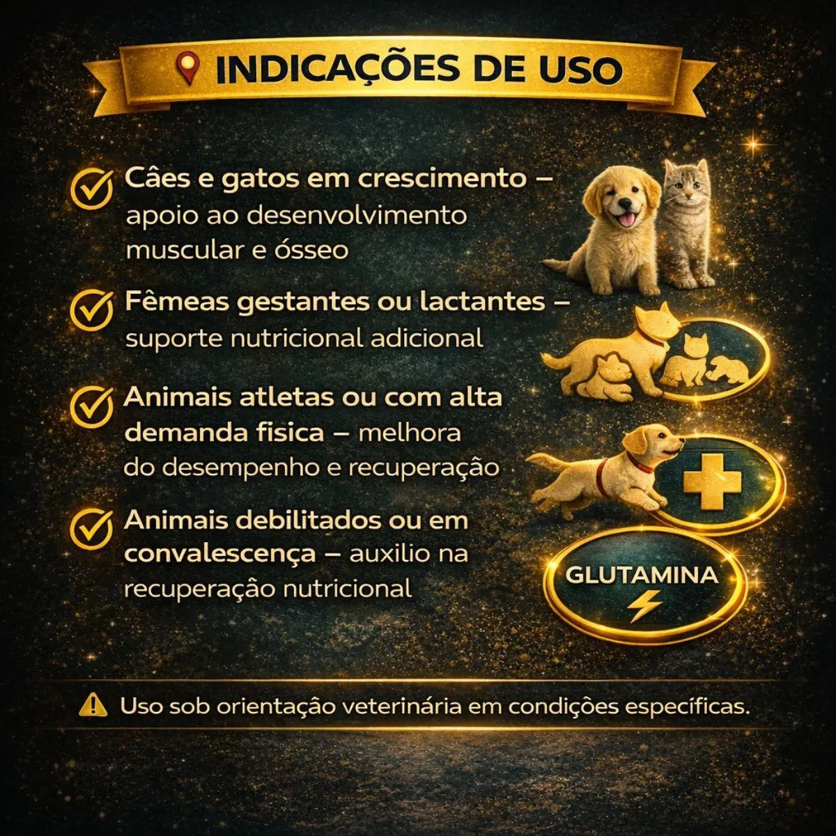 - Contribui para a recuperação física e nutricional de animais em diferentes condições, como crescimento, gestação, alta demanda física ou convalescença.