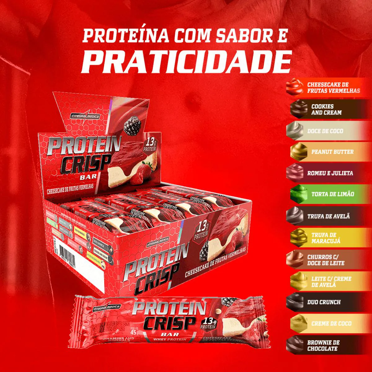 Protein Crisp é formada por 13g de proteínas de alto valor biológico. Essas proteínas são fundamentais para a construção muscular, além de serem importantes para a manutenção da massa muscular em programas de perda de peso. Por isso, pode ser consumida tanto em dietas para perda de peso, quanto em dietas para ganho de massa muscular. Por ser uma barra de proteína completa, com proteínas, gorduras essenciais e aminoácidos, sua ingestão aumenta a saciedade entre as refeições, diminuindo a vontade de comer doces e alimentos calóricos.