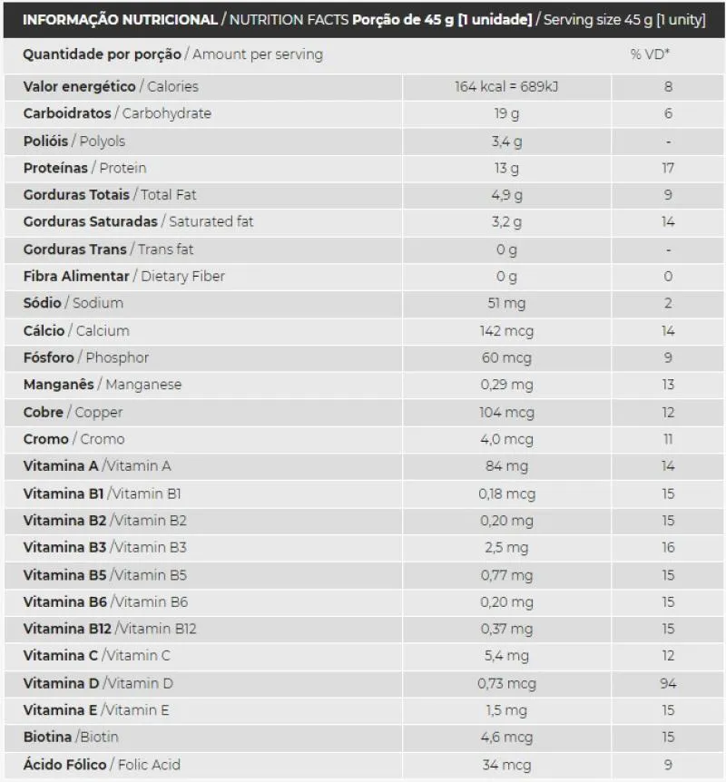 BLEND PROTEICO [PROTEÍNA CONCENTRADA DO LEITE, PROTEÍNA HIDROLISADA (colágeno), CASEINATO DE CÁLCIO, PROTEÍNA CONCENTRADA DO SORO DE LEITE], RECHEIO DE FRUTAS VERMELHAS DIET, COBERTURA SABOR CHOCOLATE BRANCO, XAROPE DE MALTITOL, XAROPE DE FRUTOSE, ÓLEO DE PALMA, CRISP ISOLADO DE soja, FRUTO-OLIGOSSACARÍDEO, MIX DE VITAMINAS [vitamina a (PALMITATO DE RETINOL), vitamina d (COLECALCIFEROL), vitamina e (ACETATO DE TOCOFEROL), vitamina c (ÁCIDO ASCÓRBICO), VITAMINA B1 (TIAMINA MONONITRATO), VITAMINA B2 (RIBOFLAVINA), VITAMINA B6 (PIRIDOXINA), VITAMINA B12 (CIANOCOBALAMINA), VITAMINA H (BIOTINA), VITAMINA PP (NICOTINAMIDA), ÁCIDO FÓLICO E VITAMINA B5 (PANTOTENATO DE CÁLCIO)], MIX DE MINERAIS (SULFATO DE MANGANÊS, CROMO E SULFATO DE COBRE), CLORETO DE SÓDIO, GLICERINA (UMECTANTE), AROMA IDÊNTICO AO NATURAL, LECITINA DE SOJA (EMULSIFICANTE), ÁCIDO CÍTRICO (ACIDULANTE) E SORBATO DE POTÁSSIO (CONSERVANTE).