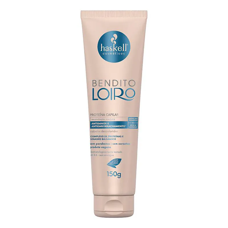Proteína Capilar Bendito Loiro 150g - Haskell Indicação: cabelos descoloridos Reconstrói a estrutura interna do fio, reduz o risco de quebra e possui propriedade antiemborrachamento. Pode ser utilizada antes do shampoo ou logo após a química. Ideal para recuperar os cabelos descoloridos; A linha possui ação antiemborrachamento e antiporosidade, protegendo os fios de danos futuros; Sua formulação conta com complexo de proteínas e vinagre balsâmico que, juntos, promovem a regeneração capilar de maneira intensiva, repondo a massa proteica nos fios. Direção olfativa: floral frutal Especificações: pH 3.5 sem parabenos| sem corantes low poo Modo de usar: com os cabelos levemente umedecidos, aplique a Proteína Capilar mecha por mecha, em todo o comprimento dos fios e espalhe uniformemente pelos cabelos. Enluve com as mãos, deixe agir por 10 minutos e, em seguida, lave os cabelos como de costume. Potencialize os resultados utilizando toda a linha Bendito Loiro. Imagens Meramente Ilustrativas. Todas as Informações Divulgadas são de Responsabilidade Exclusiva do Fabricante/fornecedor.