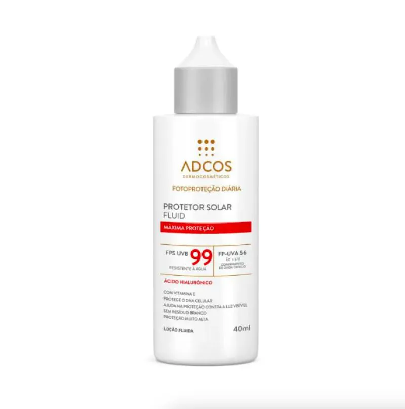 Protetor Solar Adcos Fluid FPS99 Incolor 40ml O Protetor Solar Adcos Fluid FPS 99 Incolor é um filtro solar de alta proteção com textura fluida e incolor, que não deixa a pele esbranquiçada. Possui rápida absorção, resistência à água e é indicado para peles secas e normais, inclusive sensíveis ou submetidas a procedimentos dermatológicos.Sua fórmula contém ativos calmantes e reparadores (alantoína e bisabolol), ácido hialurônico (hidratação profunda e estímulo ao colágeno), vitamina e, Alistin e Melanin, promovendo ação antioxidante, antienvelhecimento, antiglicante e proteção contra UVA, UVB, infravermelho e luz visível. Também protege o DNA celular e não é comedogênico.A versão tonalizante é semelhante, mas contém pigmento adaptável que uniformiza o tom da pele e disfarça imperfeições.