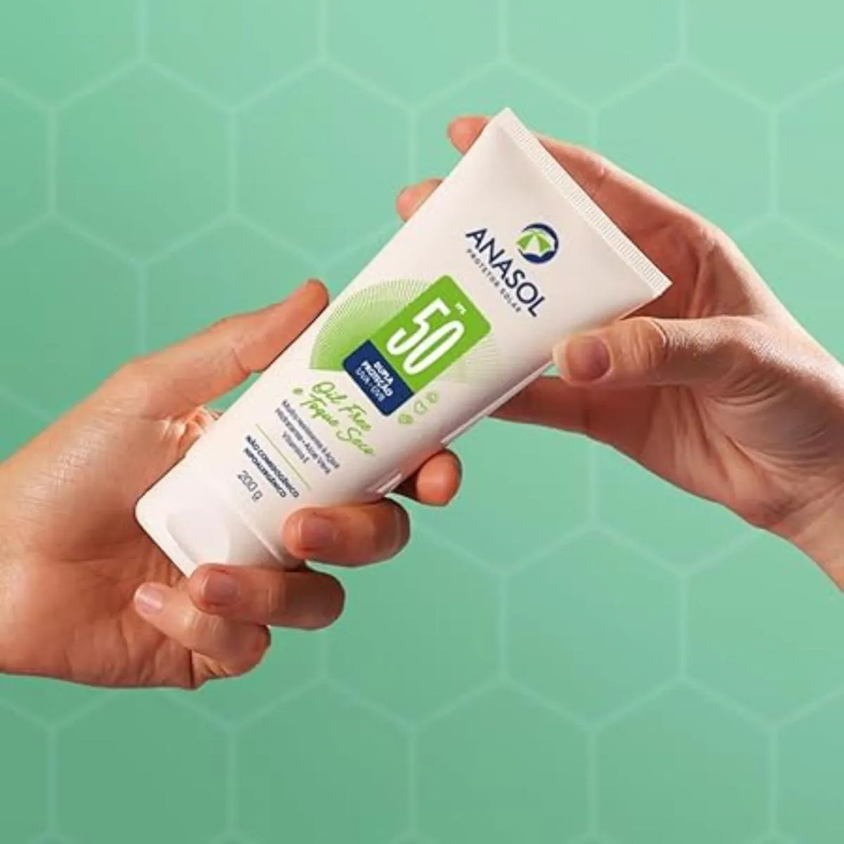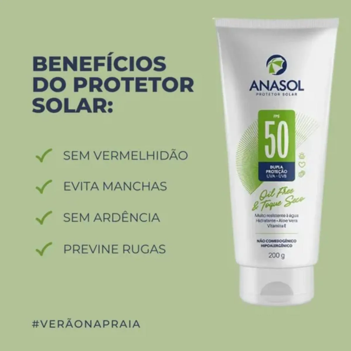 O Protetor Solar Anasol FPS 50 Toque Seco é um produto de proteção solar desenvolvido com uma fórmula de rápida absorção e toque seco. Sua composição foi criada para oferecer proteção contra radiação solar, com características específicas de não deixar a pele oleosa.