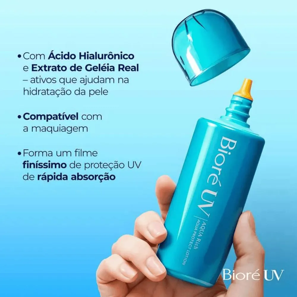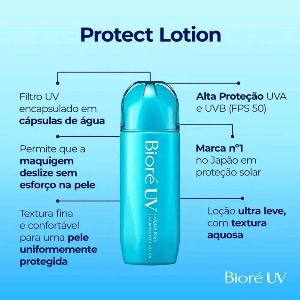 O Bioré Aqua Rich Aqua Protect Lotion é protetor solar facial e corporal que espalha facilmente como água e forma um filme fino de proteção UV de rápida absorção.