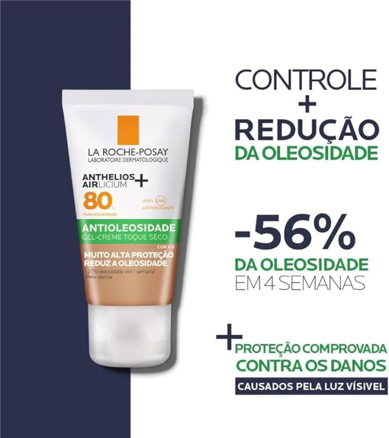 Protetor solar facial com cor. La Roche-Posay Anthelios Airlicium FPS80 protege e oferece um tratamento que reduz a oleosidade em 27% em apenas uma semana e 56% em um mês.