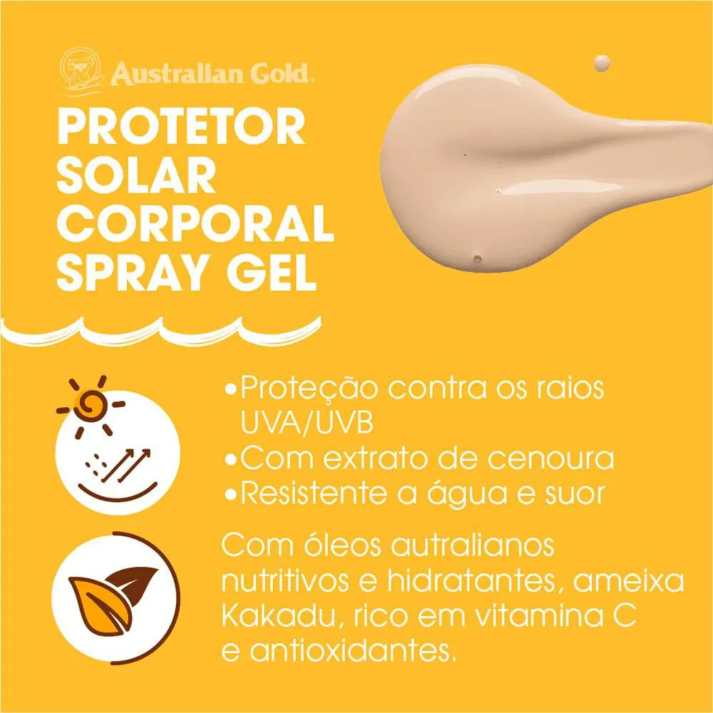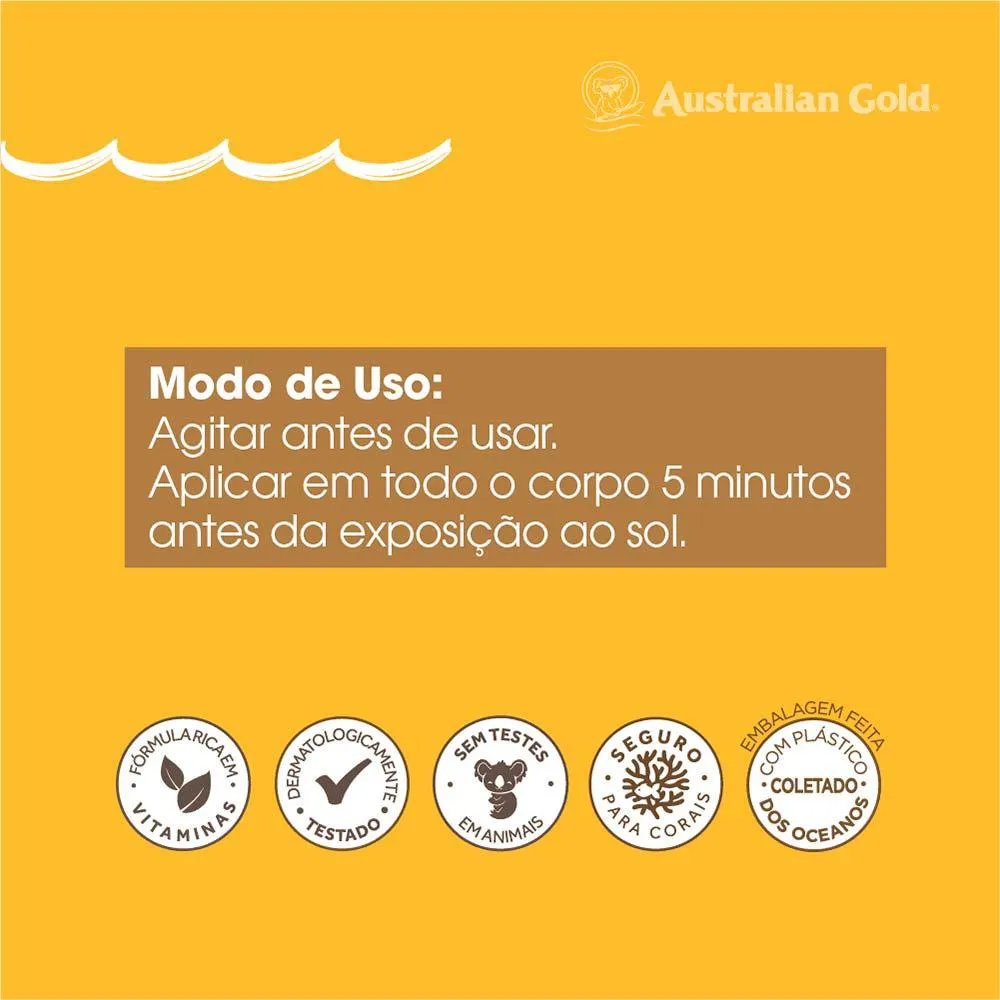 Protetor Solar Corporal FPS 8 da marca Australian Gold promove um bronzeado Instantâneo, que oferece uma suave coloração dourada à pele, e alta qualidade em proteção solar. Sua fórmula em spray gel é resistente à água, tem textura agradável e é de rápida absorção.