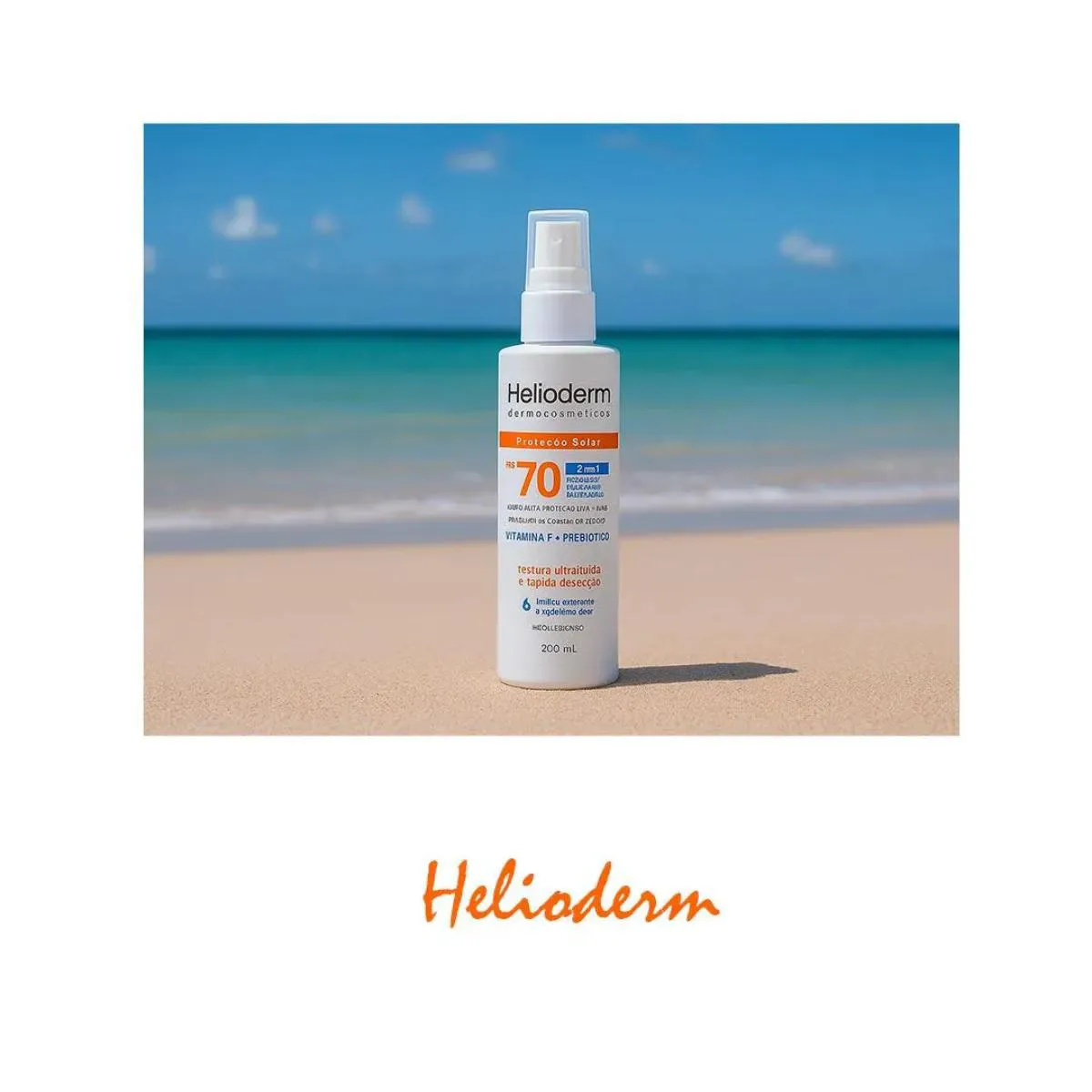 O que é e para que serve o Protetor Solar Corporal Helioderm Suncare FPS70 spray?O Protetor Solar Corporal Helioderm Suncare FPS70 Spray é um dermocosmético desenvolvido com tecnologia farmacêutica que oferece muito alta proteção contra os raios UVA e UVB. Sua fórmula multifuncional 3 em 1 protege contra os danos solares, hidrata a pele e possui ação antioxidante que combate os radicais livres, prevenindo o envelhecimento precoce. Com jato direcionador, permite aplicação prática e uniforme em todos os ângulos do corpo. Pode ser utilizado na pele seca ou molhada, possui rápida absorção, toque seco e não deixa sensação oleosa. Ideal para uso na praia, piscina ou durante atividades físicas. Dermatologicamente testado e aprovado.