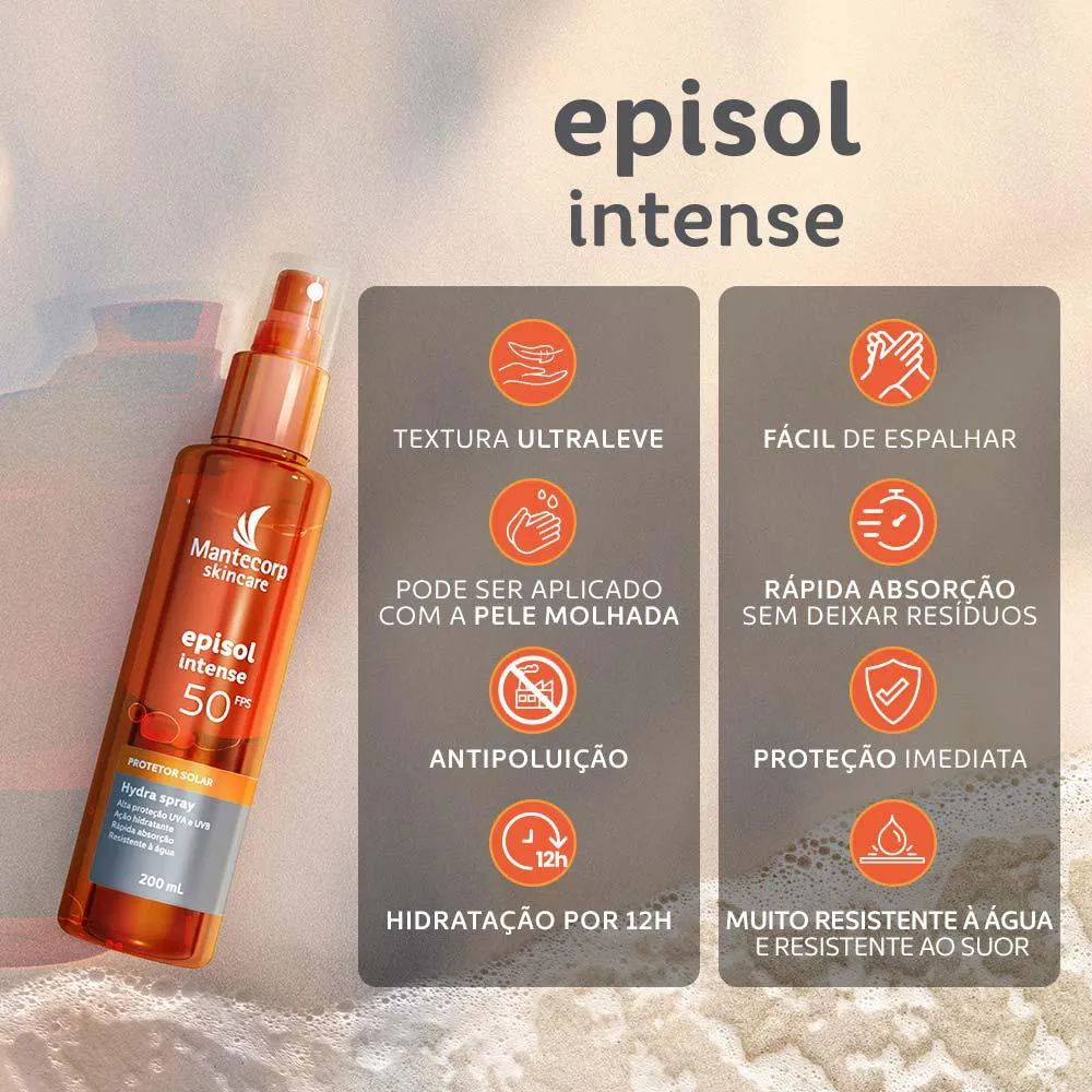 Episol Intense Hydra spray FP550 é um protetor solar corporal bifásico com Ácido Hialurônico que, além de oferecer alta proteção contra os raios UVA e UVB, possui alto poder hidratante.