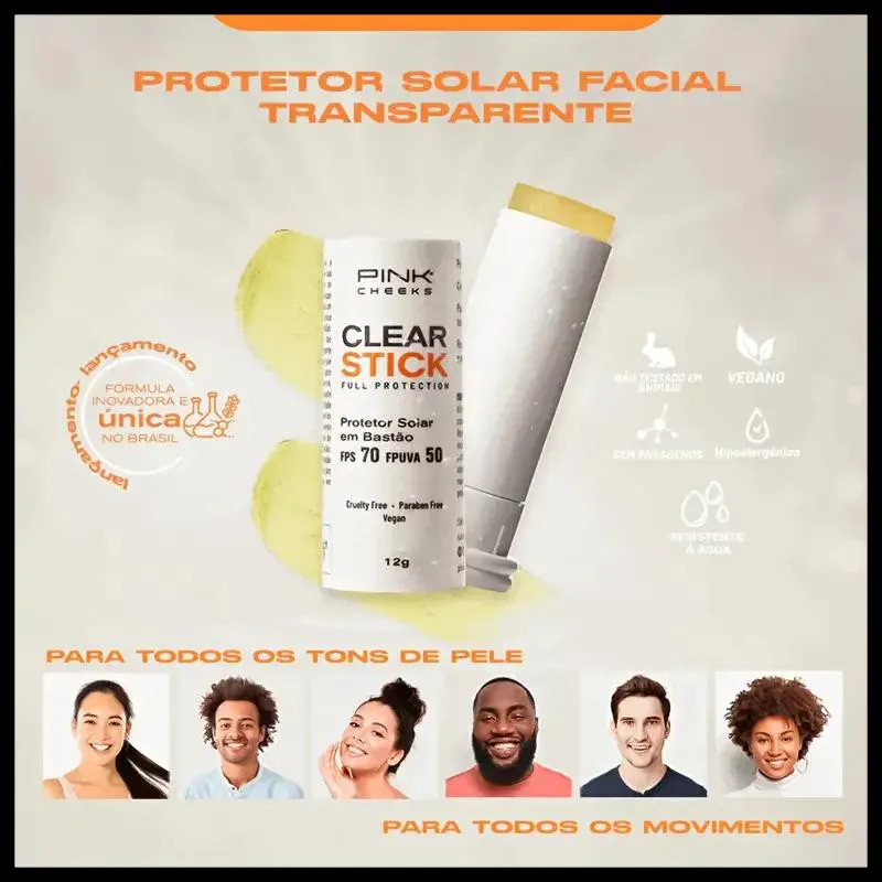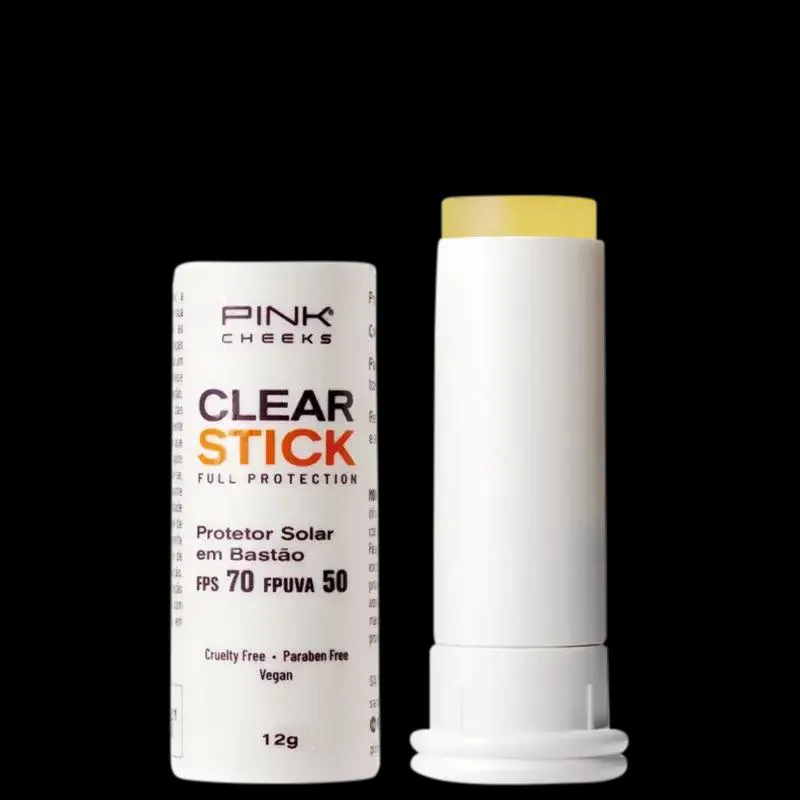 Protetor solar. Cheeks Clear Stick FPS70 FPUVA50 possui uma cobertura incolor que não deixa resíduos e conta com um alto nível de proteção. O Protetor Solar Cheeks Clear Stick FPS70 FPUVA50 garante um acabamento natural e toque seco, ideal para ser usado no dia a dia e durante atividades físicas. Sua pele vai ficar protegida por um longo tempo de modo rápido e prático! Modo de usar: Aplique o protetor solar de maneira abundante por toda extensão do rosto, incluindo a região dos olhos. Após a aplicação, espalhe o produto com os dedos ou esponja até ficar uniforme. Pode ser reaplicado ao longo do dia para reforçar a proteção.